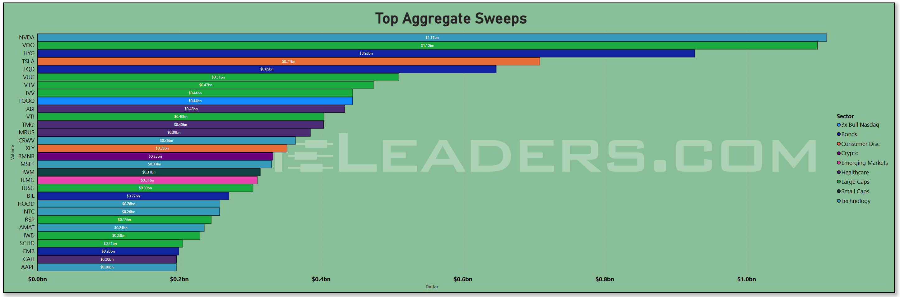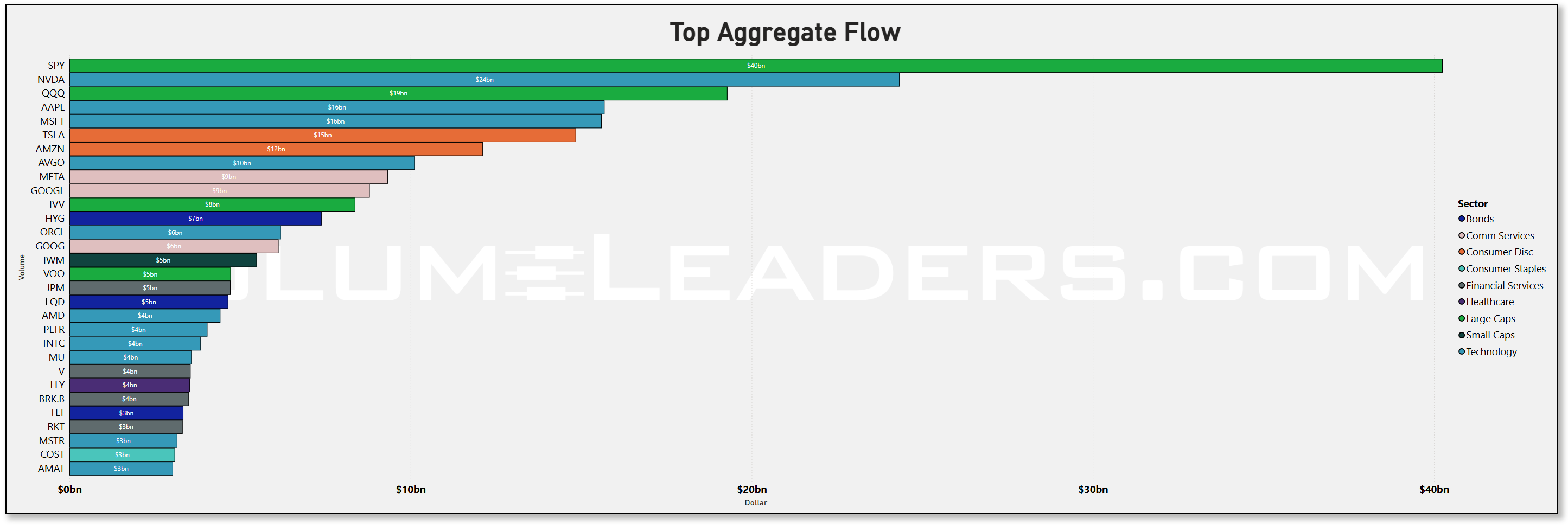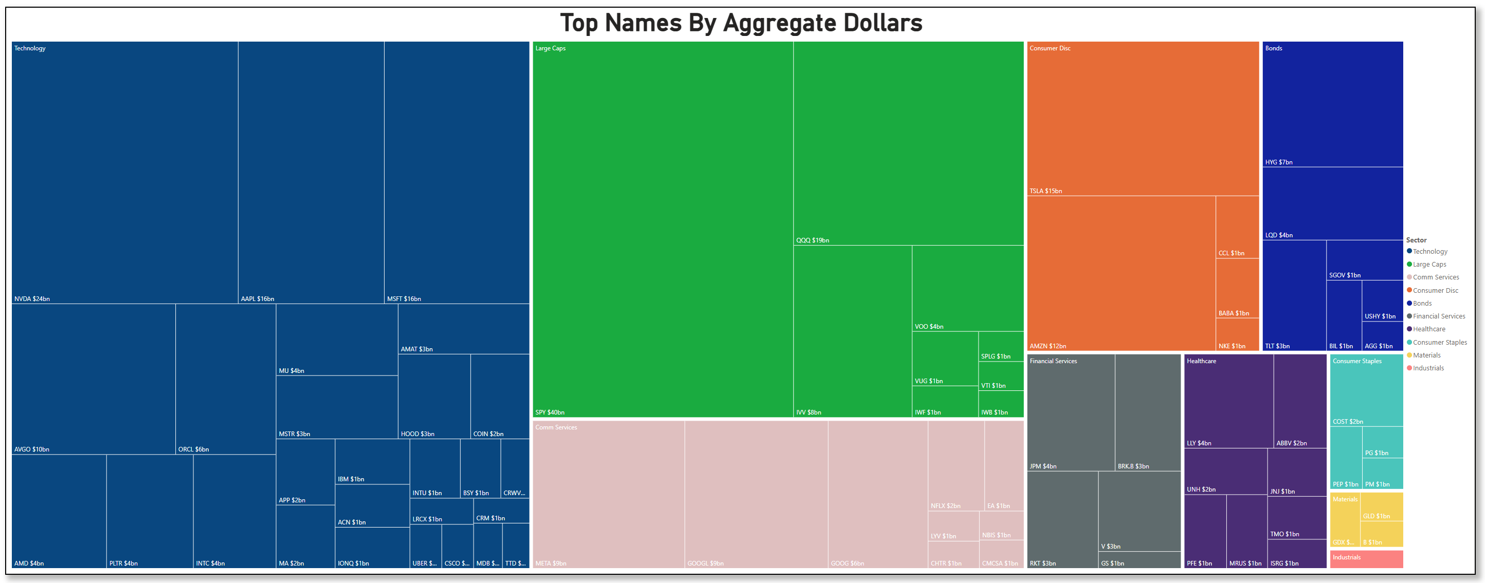 The allocation lens is obvious in the treemap and the aggregate dollars bar. SPY sits on top at roughly $40b this week, followed by NVDA around $24b and QQQ near $19b. AAPL and MSFT cluster at about $16b each, then TSLA around $15b and AMZN near $12b. The breadth inside Tech is real: AVGO (~$10b), ORCL (~$6b), AMD (~$4b), PLTR (~$4b), INTC (~$4b), MU (~$4b), and AMAT (~$3b) all print meaningful dollars alongside the megacaps. Communications shows steady size through META (~$9b) and the GOOG/GOOGL pair (~$9b + ~$6b). Index wrappers beyond SPY/QQQ were well represented with IVV (~$8b) and VOO (~$5b), while credit ETFs logged HYG (~$7b) and LQD (~$5b). That mix—big index sleeves plus a dense cluster of AI semis and platform software—reads like allocation into Q4 strength with deliberate overweight to compute.