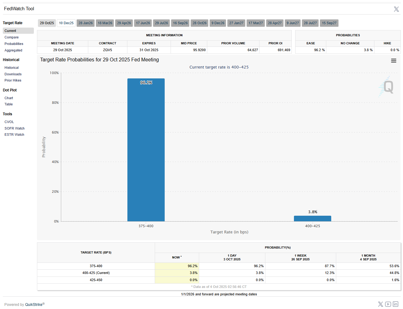 Domestically, despite the day’s backup in yields, the forward policy curve remains firmly tilted to easing. Markets are pricing a 98% chance of a -25 bp rate cut at the next FOMC meeting on Oct 28-29. That expectation sits uneasily next to the Fed-speaker tape, but with the shutdown darkening key data windows, traders appear comfortable defaulting to the idea that growth risks and lagging policy transmission argue for further accommodation unless inflation reaccelerates.