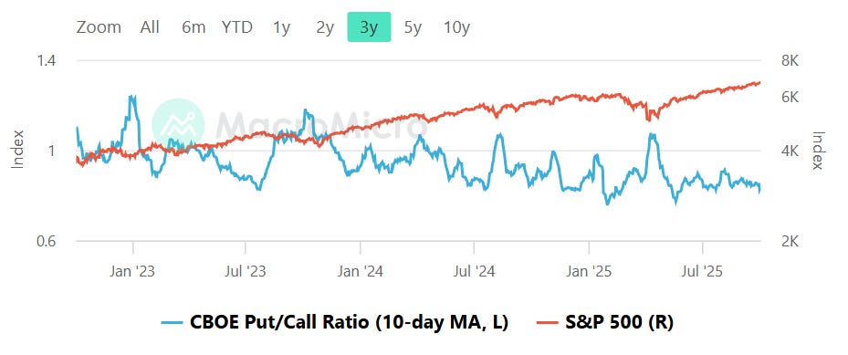 The 10-day average is hovering below 1.0 and closer to the high-0.8s, consistent with lighter hedging than we saw during the summer spikes. This backdrop usually dampens rebound amplitude and can let pullbacks run until demand for protection rises. If the 10-day average sinks toward ~0.8 and sticks there, that would signal froth and raise the risk of mean-reversion chop. A jump back above ~1.0 would indicate renewed fear and improve the quality of dip-buys.