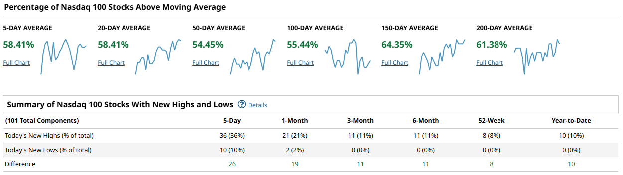 The Nasdaq 100 is constructive, if a touch less robust at the 50–100 day marks. Above-average readings register 58.41% on both the 5- and 20-day, 54.45% on the 50-day, 55.44% on the 100-day, 64.35% on the 150-day, and 61.38% on the 200-day. New highs dominate: 36 highs vs 10 lows over 5 days (+26), 21 vs 2 over 1 month (+19), 11 vs 0 over both 3 and 6 months (+11 each), 8 vs 0 on 52-week (+8), and 10 vs 0 year-to-date (+10). The message is healthy but more selective than the S&P: leadership is present, deterioration is minimal, yet the 50–100 day cohorts in the mid-50s say rotation underneath the surface is still ongoing. A push in the 50-day measure toward 60% would confirm a broader tech bid.