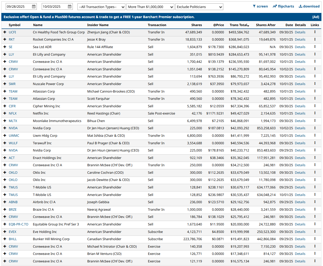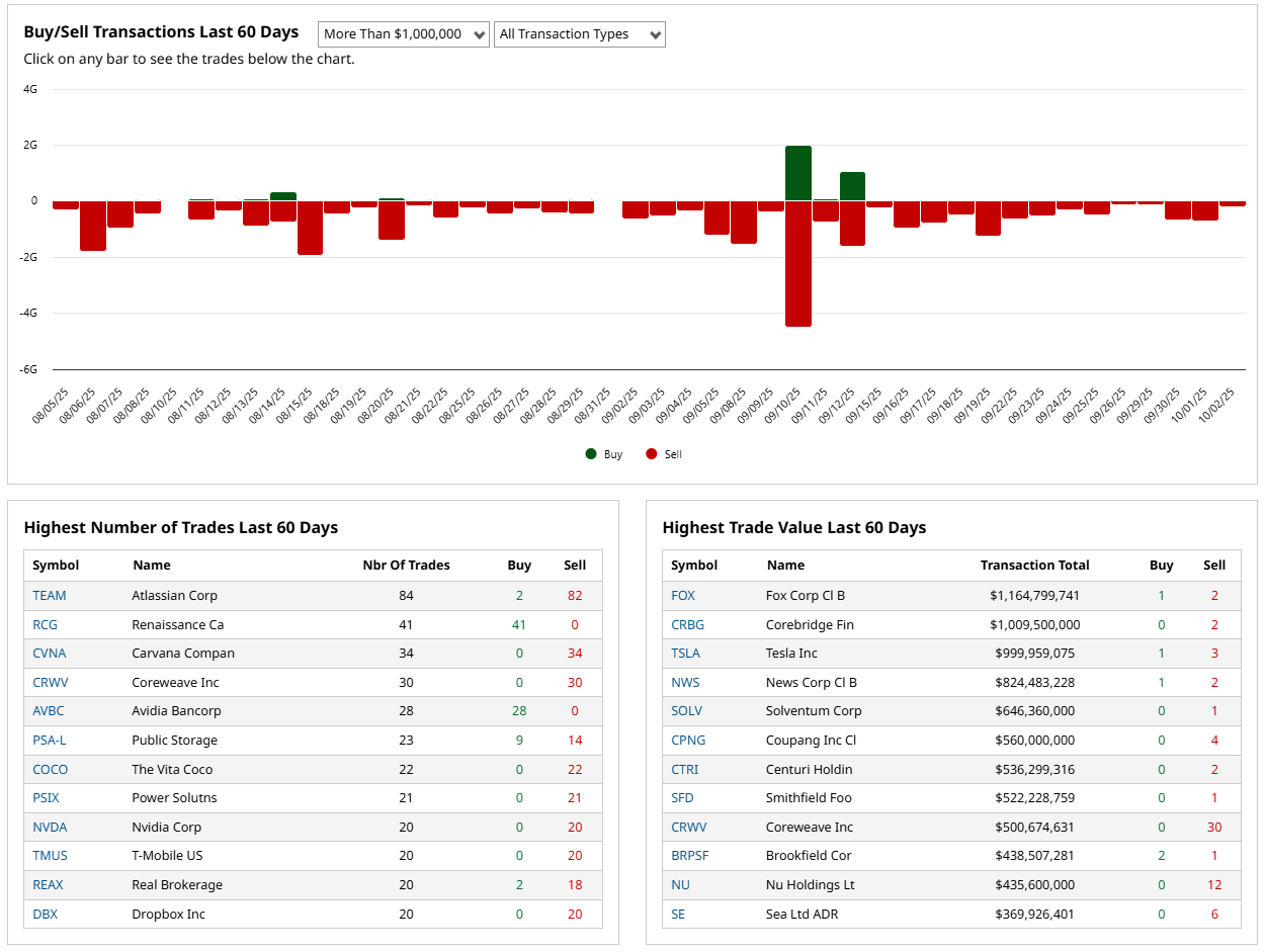 Over the last 60 days, insider flow skews to distribution. The highest-value tape is heavy on sells: Fox Corp B booked $1.165B across 1 buy and 2 sells, Corebridge Financial $1.009B with 0 buys and 2 sells, Tesla $999.96M with 1 buy and 3 sells, News Corp B $824.48M with 1 buy and 2 sells, and Coupang $560.0M with 0 buys and 4 sells. Coreweave stands out with $500.7M and a striking 0 buys vs 30 sells. Nu Holdings shows $435.6M with 0 buys vs 12 sells, and Sea Ltd ADR $369.9M with 0 buys vs 6 sells. There are a few bright spots: Brookfield Corp posted $438.5M with 2 buys vs 1 sell, and at the activity level Renaissance (RCG) logged 41 buys and 0 sells while Avidia Bancorp showed 28 buys and 0 sells. By count, notable clusters of pure selling include Atlassian (82 sells), Carvana (34 sells), Coreweave (30 sells), Nvidia (20 sells), T-Mobile (20 sells), Dropbox (20 sells), Vita Coco (22 sells), and Power Solutions (21 sells). This week’s blotter is dominated by administrative transfers and exercises but also contains large open-market sales: Nuscale Power sold 2,138,619 shares (~$80M), Netflix’s Reed Hastings sold post-exercise (~$49M), and Nvidia’s Jensen Huang sold 225,000 shares twice (~$42M and ~$40M). Net read: insiders are distributing more than accumulating, which tilts defensive unless and until we see a sustained pickup in open-market buys, particularly in the largest-cap leaders.