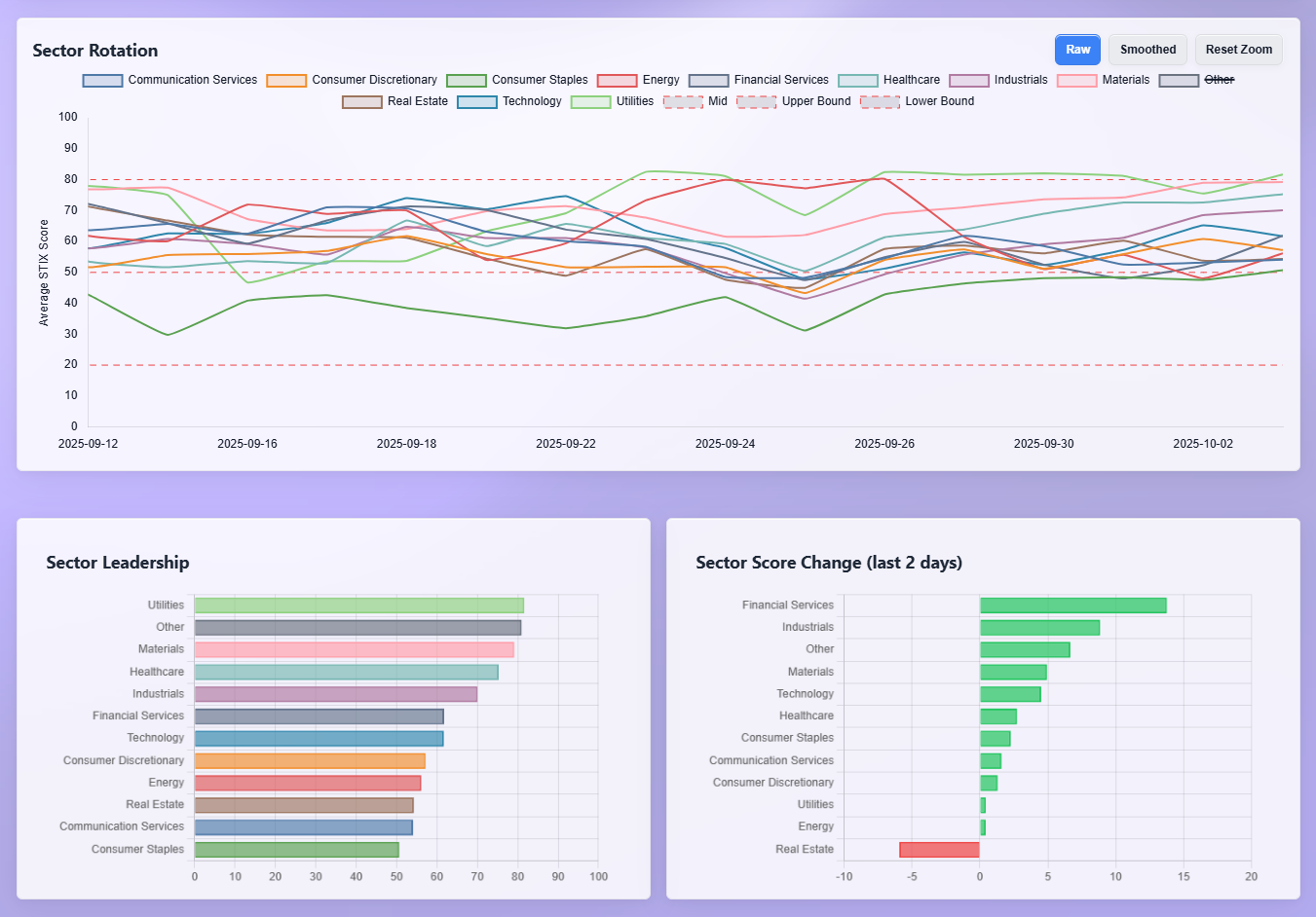 Rotation corroborates the flow. On the leadership board, Utilities sit at the top, with Health Care, Industrials, and Materials not far behind. Technology is mid-pack but rising, and Consumer Discretionary sits below median. The two-day momentum change tilts pro-cyclical: Financials and Industrials show the largest positive jumps, followed by a lift in Materials and Technology. Real Estate is the notable laggard over the last two sessions. That pattern maps cleanly to what crossed the tape: credit ETFs and defensives saw persistent dollars early in the week, then flows expanded toward Financials and industrial cyclicals while AI heavyweights retained sponsorship. If that two-day re-acceleration in Financials sticks, it favors a broadening rally rather than a narrow mega-cap grind.