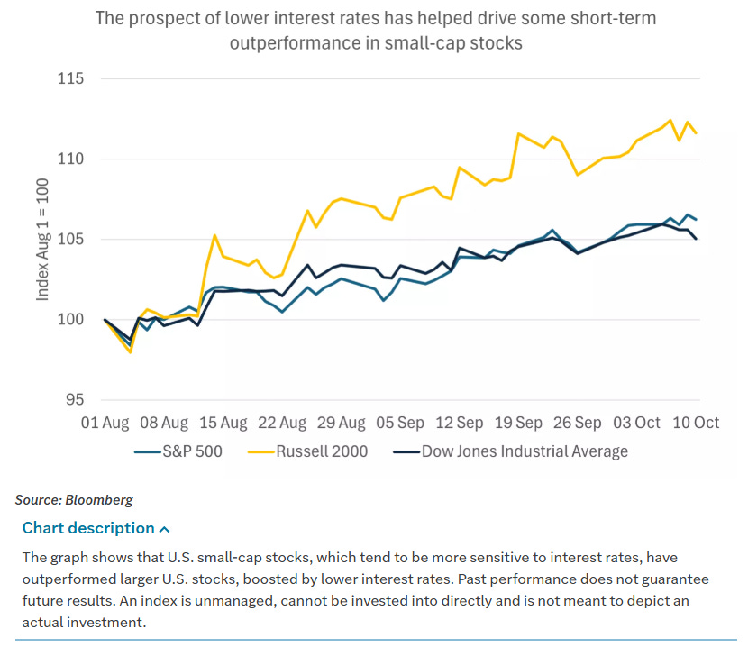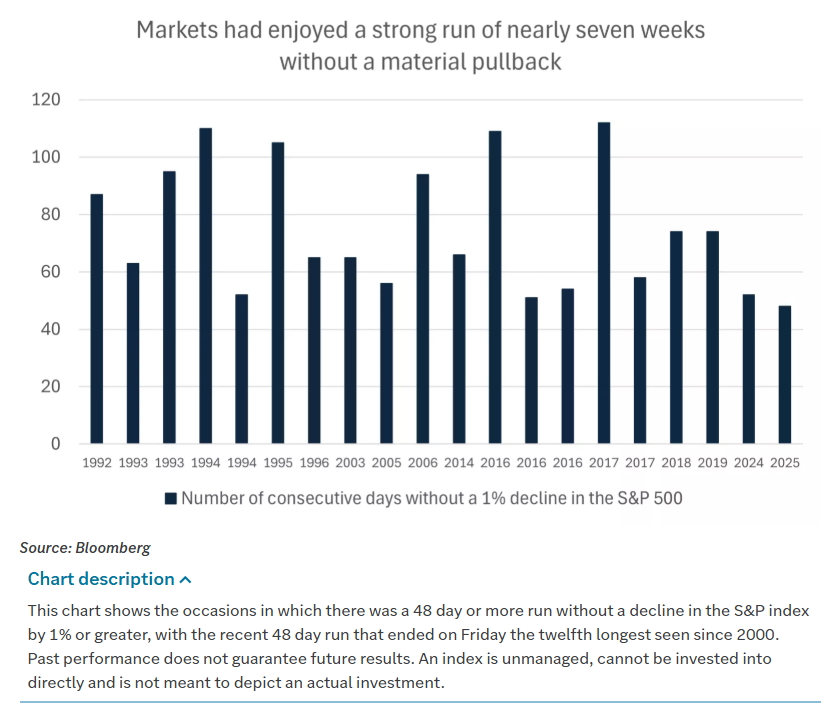 The key takeaways are simple enough. The government shutdown has entered its second week, and the economic impacts grow with each additional day. Markets are largely discounting the shutdown and focusing on AI, rates, and trade policy. Record gold prices are one lens on political dysfunction and longer-term fiscal concerns. Friday’s selloff may inaugurate a more volatile October after a strong run. Volatility is normal; dips of 5%–10% occur three to four times per year on average. If the policy noise cools and earnings hold, those dips will present opportunities for buyers or for diversifying portfolios. If the noise grows louder, those dips will require more selectivity and tighter risk controls.