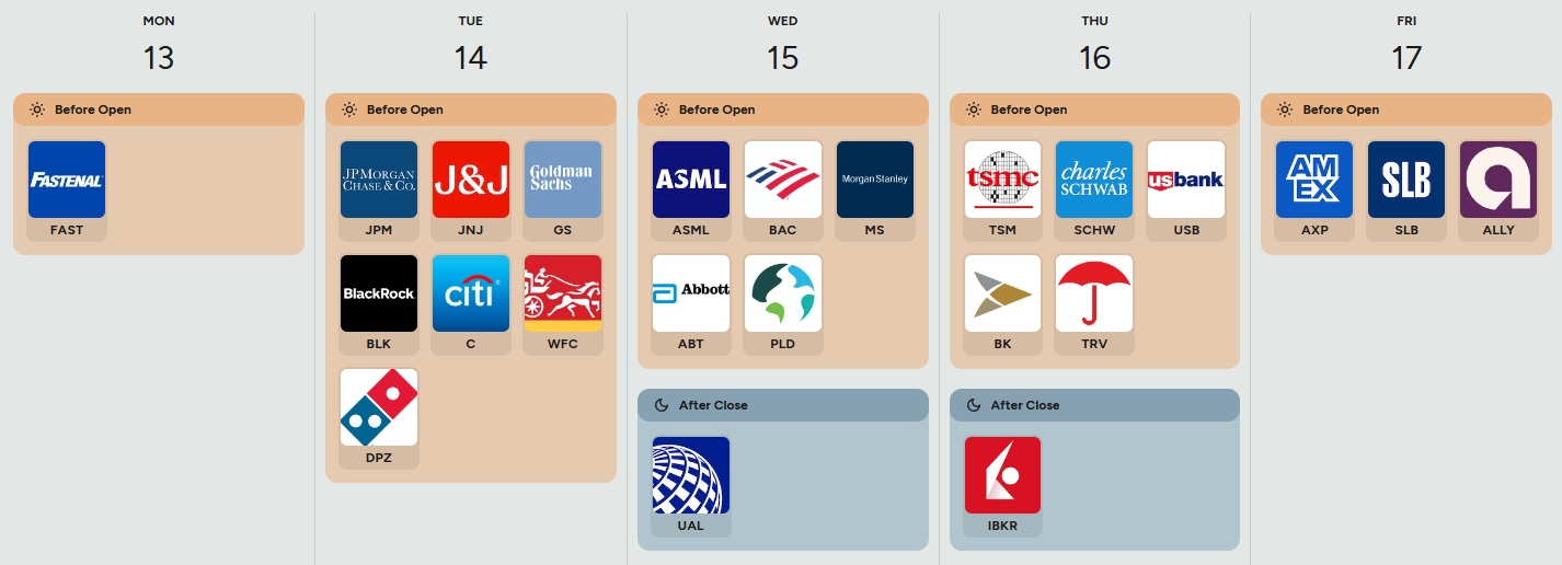 For earnings, the board centers on banks, semis, and payments with macro spillover. Tuesday’s open brings JPM, JNJ, GS, BLK, C, WFC, and DPZ. For the banks, watch net interest income direction versus deposit betas, credit costs, card loss provisioning, and trading fees; beats on markets and stable credit would support broader cyclicals, while margin compression or rising charge-offs would weigh on risk. Wednesday features ASML, BAC, and MS before the bell and UAL after; ASML’s order book and EUV commentary are a read on capex, while BAC/MS echo the money-center themes. Thursday brings TSM, SCHW, USB, BK, and TRV before the open, plus IBKR after; TSM’s capacity utilization and capex guide set tone for semis and equipment. Friday opens with AXP, SLB, and ALLY; AXP’s spend growth guides the consumer, SLB’s international and offshore commentary is an energy capex barometer, and ALLY’s auto credit metrics flag consumer credit stress or relief.