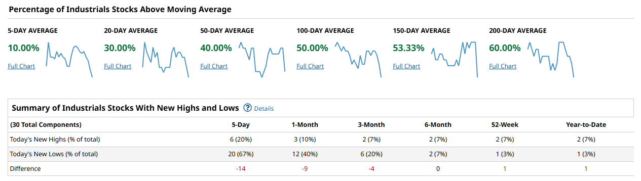 DJIA: Participation sits at 10.00% above the 5-day, 30.00% above the 20-day, 40.00% above the 50-day, 50.00% above the 100-day, 53.33% above the 150-day, and 60.00% above the 200-day. New highs minus lows is -14 (5-day), -9 (1-month), -4 (3-month), then 0 (6-month), +1 (52-week), and +1 year-to-date. Short-term weakness is real, but the long base is still intact and even slightly improving at the longest horizons.