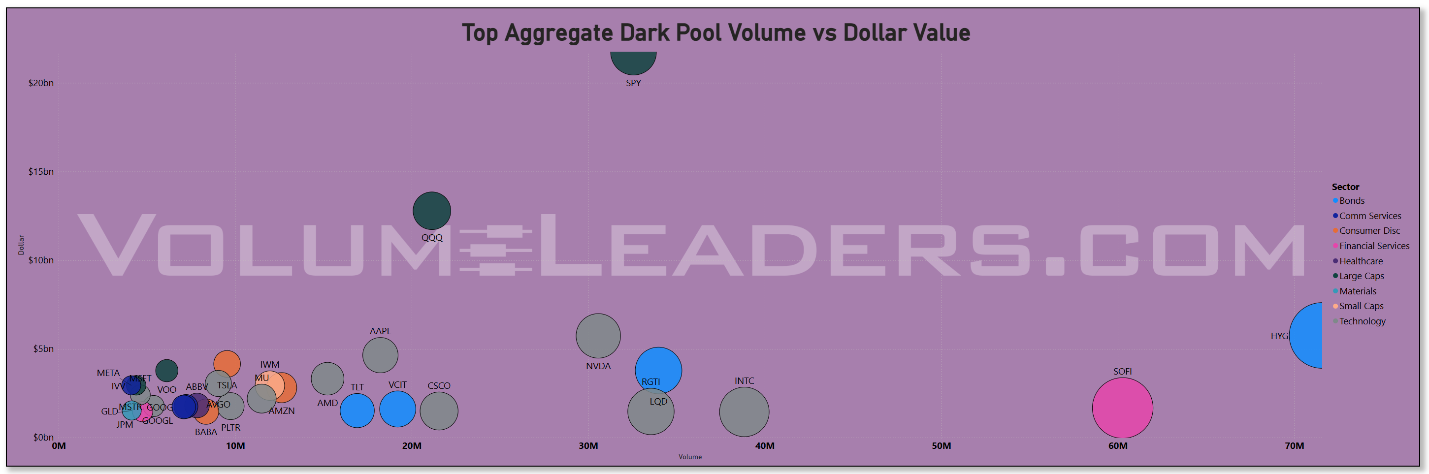 The scatter corroborates it: very large dollar prints at moderate volumes in SPY/QQQ, and unusually busy prints in HYG and SOFI, with HYG pushing toward ~70M shares on the x-axis with multi-billion notional on the y-axis. That is the tape of credit hedging and balance-sheet tuning, not panic.