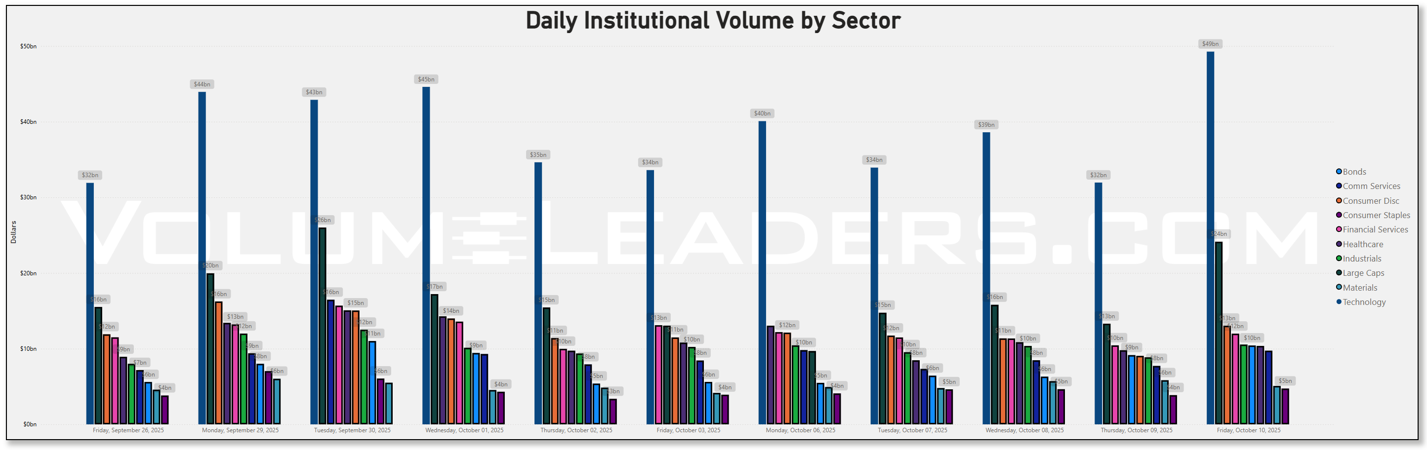 Tech started the week near ~$40b and built into a ~$49b crescendo on Friday. That surge coincided with the tariff shock and the broad selloff, which tells you the largest books transacted where the market’s duration of growth lives. Bonds did ramp through the week, but from a much smaller base—roughly ~$5b early to around ~$10b on Friday—as managers added duration and credit sleeves into the flush. Large Caps were the second engine, finishing the week with a late pop to roughly ~$24b on Friday. Communication Services, Consumer Discretionary, and Industrials printed mid-single to low-teens billions most days, with a catch-up on the final session as de-risking broadened. The pattern says institutions didn’t abandon Tech in advance; they were forced to price a new policy shock in Tech first, then used index and bond wrappers to reshape risk into the close.