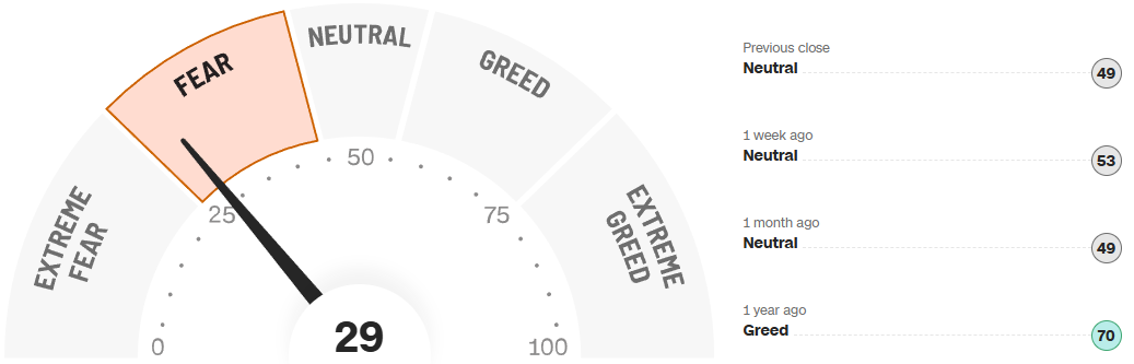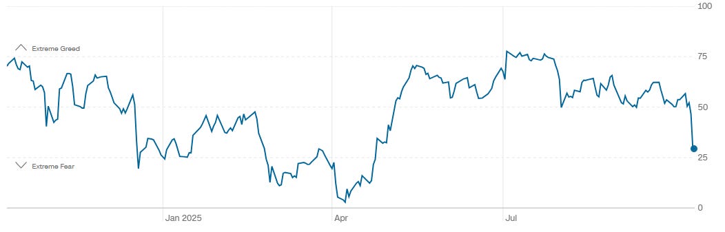 The composite sits at 29, squarely in Fear, down from 49 at the previous close and 53 a week ago, and far below 70 a year ago. The one-year path has rolled over sharply toward the lower quartile of its range. This is not capitulation, but it is a meaningful sentiment reset versus the summer’s mid-50s to 70s prints. In practice, Fear readings in the 20s can be early for contrarians yet often precede tactical rallies if they persist while price bases. A recovery back into the 40s would confirm that selling pressure has dissipated; a dip into the teens would signal exhaustion and improve the odds of a tradable bounce, provided credit and rates stay calm.