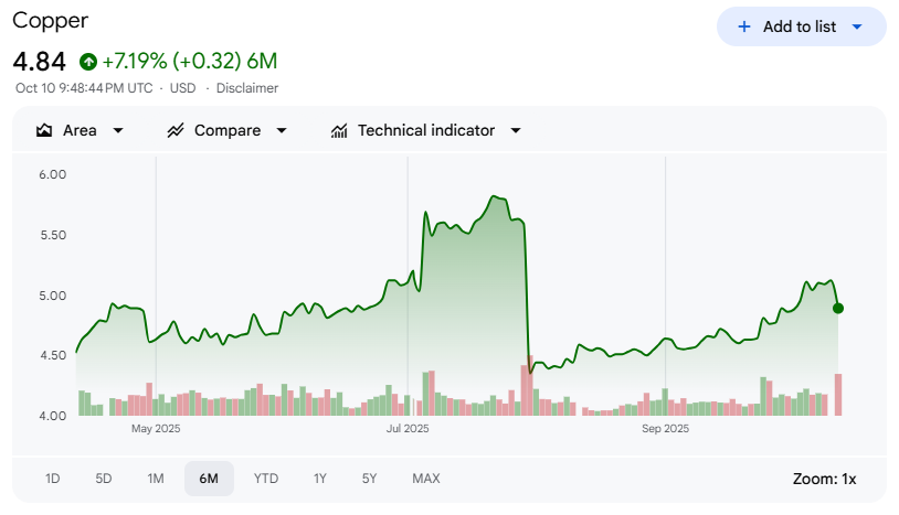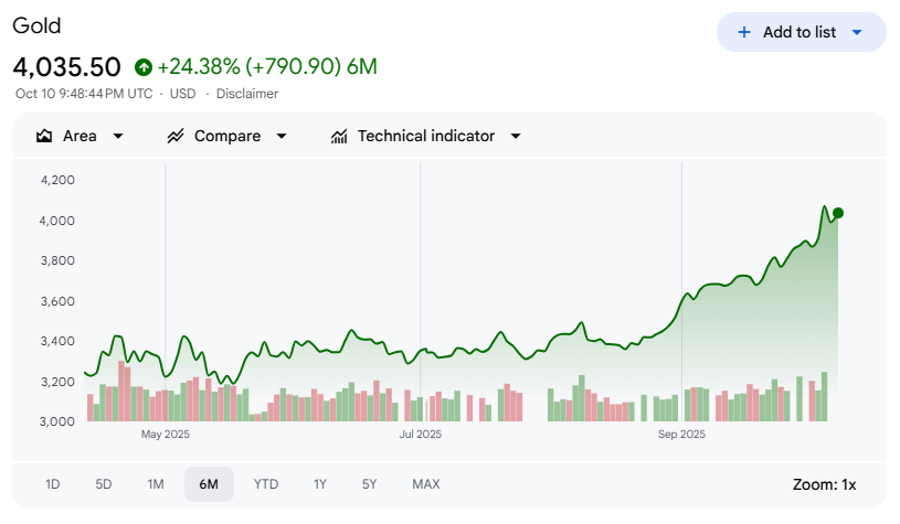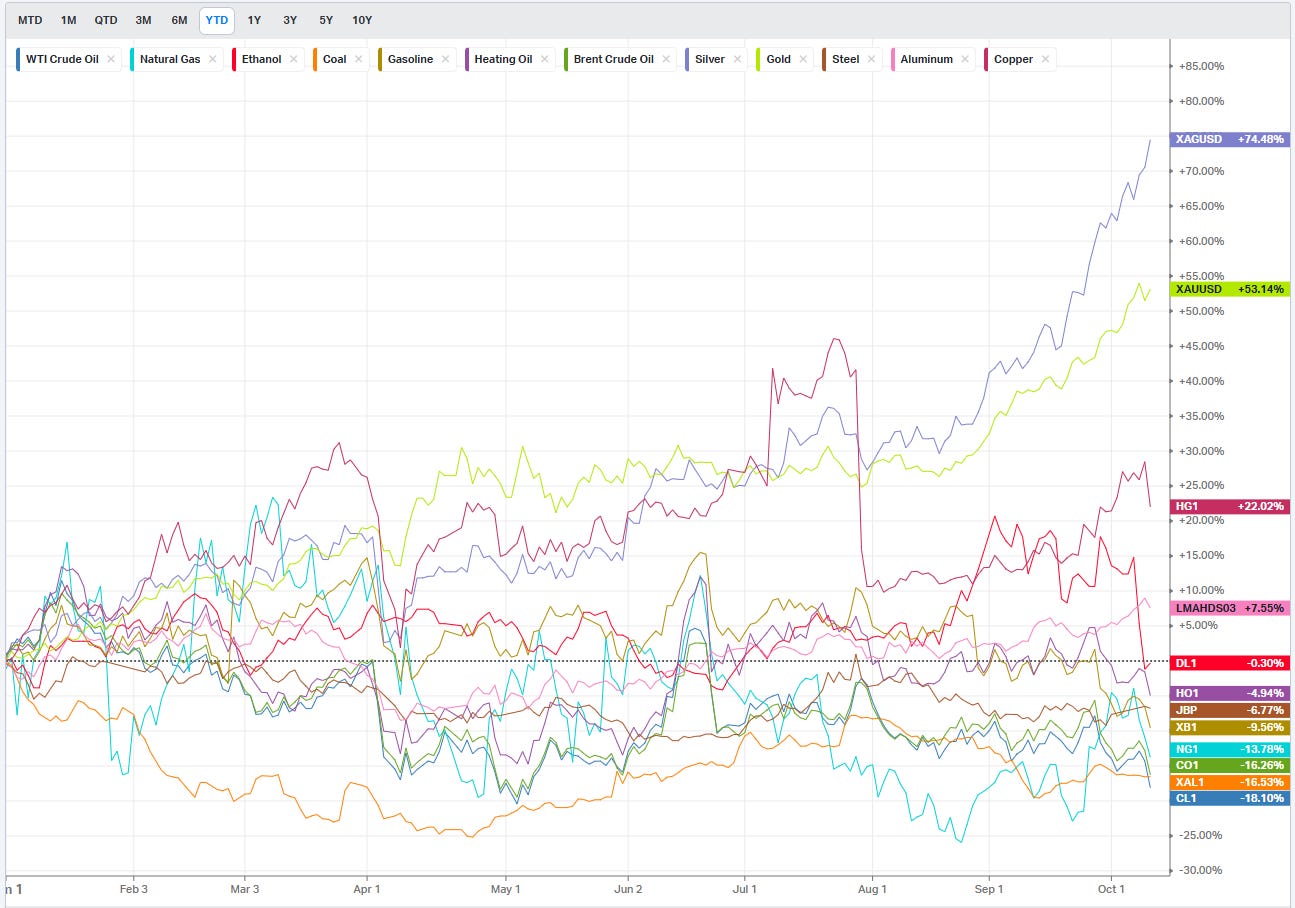 Energy weakened into the week’s end. ICE Brent had rallied off $64 lows and challenged the 50/100-day moving averages around ~$66.50 before the trade-policy bonfire reignited. The ceasefire news Friday had already taken some bid out of crude; the tariff headline accelerated a slide back to June lows. Metals diverged: gold set another all-time high above $4,000 earlier in the week, then dipped sharply Thursday as overbought conditions emerged, only to catch a new bid as the China turmoil re-ignited safe-haven demand.