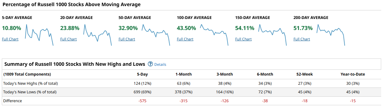 Russell 1000: The broad large-cap universe is where the stress is loudest. Only 10.80% are above the 5-day and 23.88% above the 20-day, with 32.90% above the 50-day and 43.50% above the 100-day. Longer-term participation remains constructive at 54.11% above the 150-day and 51.73% above the 200-day. New highs minus lows shows a deep short-term hole: -575 (5-day), -315 (1-month), and -126 (3-month). Even the longer windows are still negative at -38 (6-month), -18 (52-week), and -15 year-to-date. The message is clear: the average stock remains under pressure and has not yet reclaimed longer-term momentum the way the megacaps have.