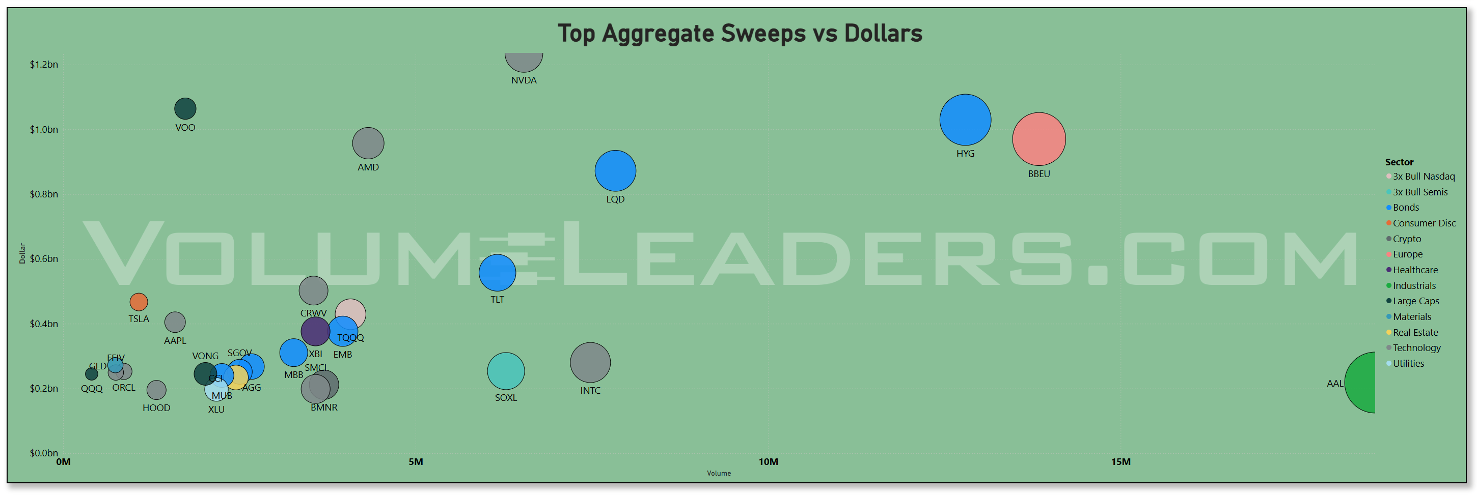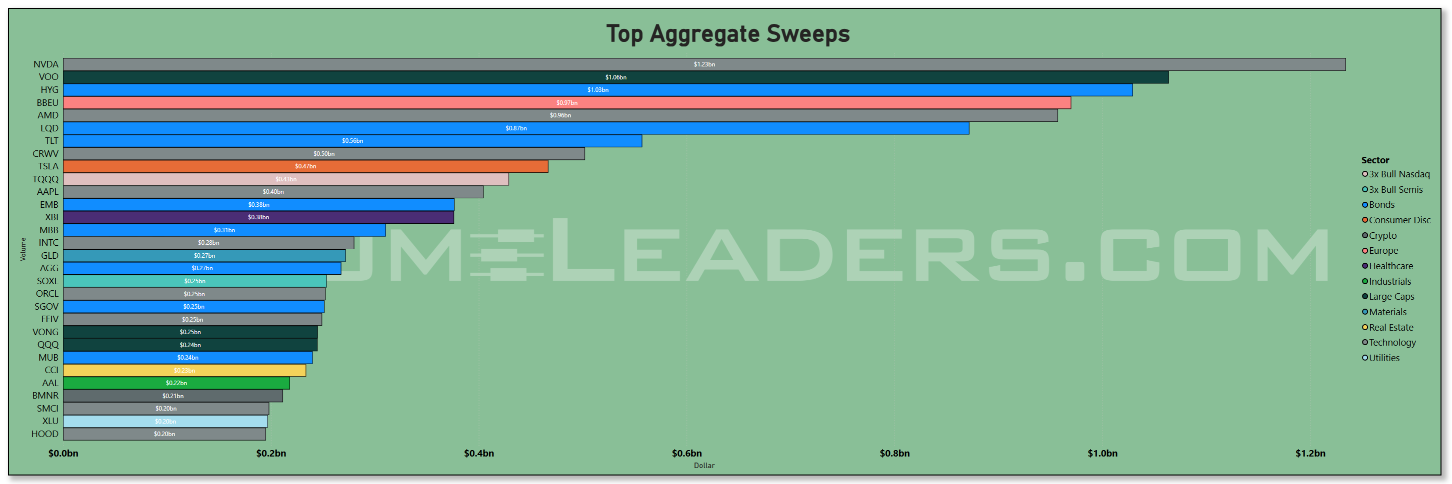 Sweeps tell you who mashed the accelerator. The fastest money pressed NVDA (~$1.23b), VOO (~$1.06b), and HYG (~$1.03b) at the top, then a mix of BBEU (~$0.97b), AMD (~$0.96b), LQD (~$0.87b), and TLT (~$0.56b). TSLA (~$0.47b) and TQQQ (~$0.43b) rounded out the risk levers, with AAPL (~$0.40b) behind them. That is a classic barbell: AI leaders and index beta on one end, credit and duration hedges on the other.