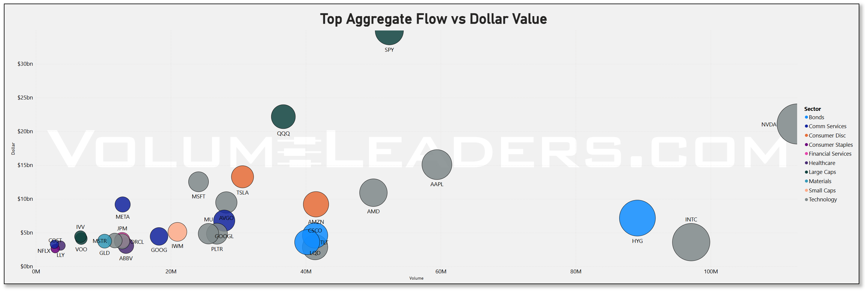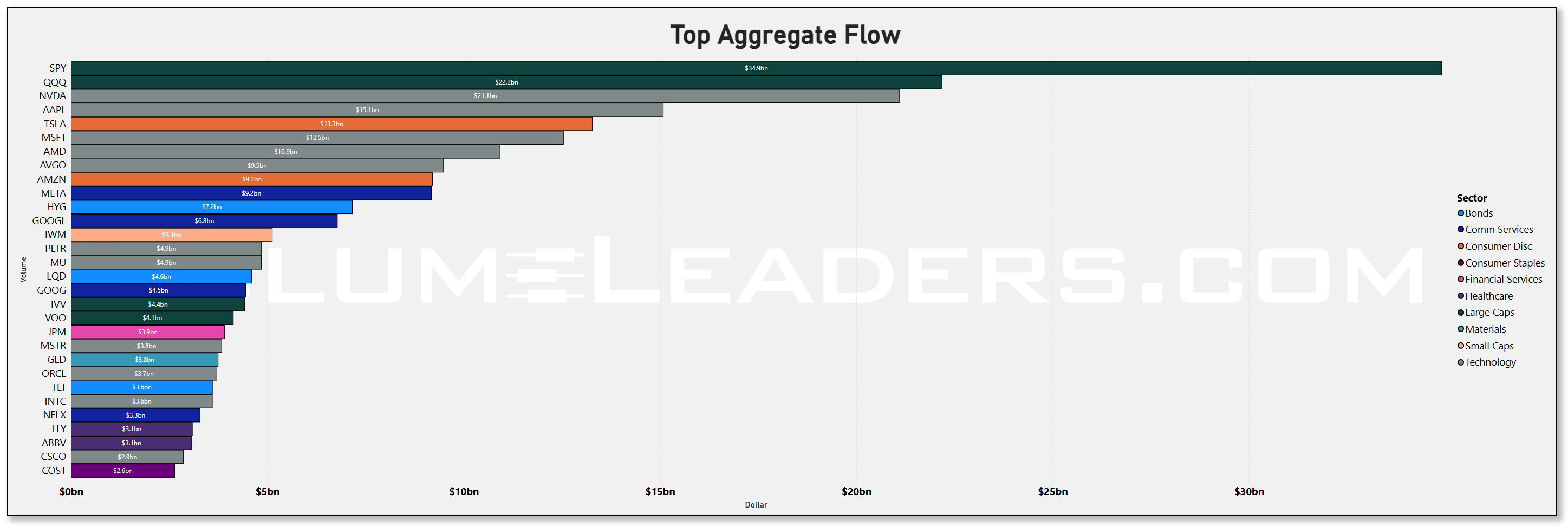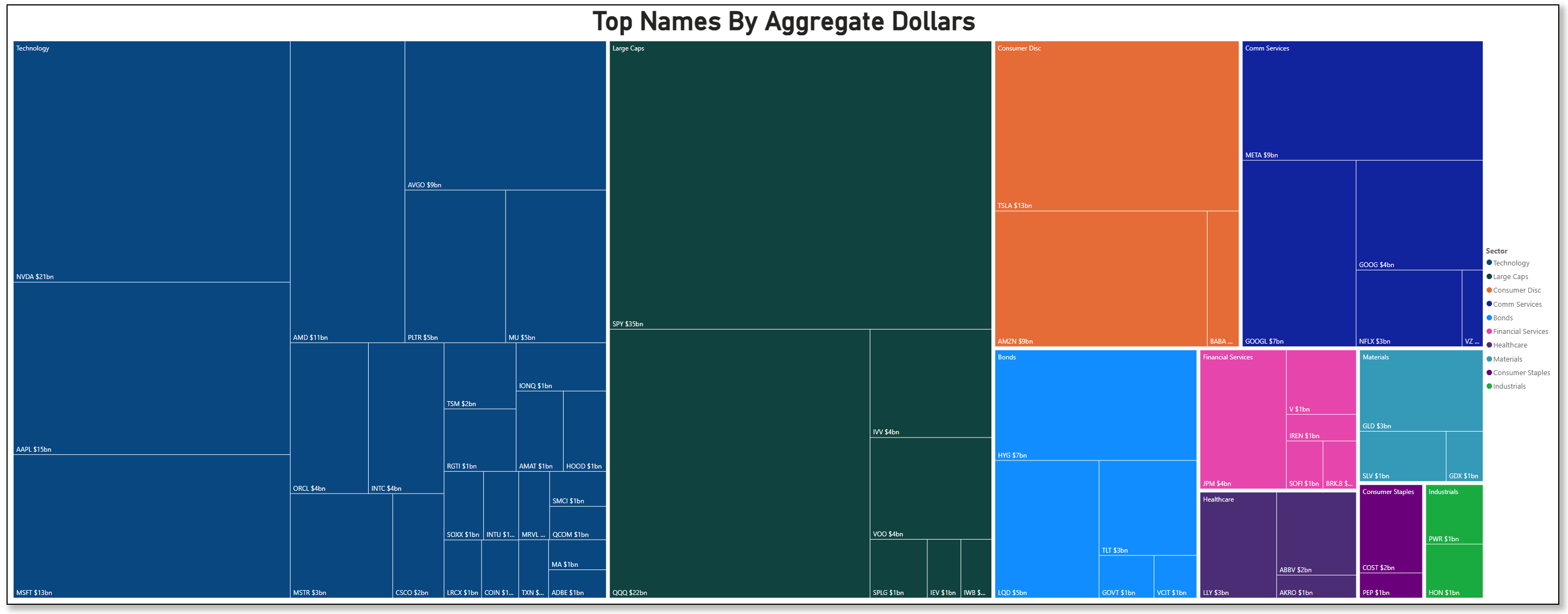 The treemap and the aggregate bars show where the real weight landed. Index vehicles and the megacaps took the lion’s share. SPY printed about $34.9b, QQQ ~$22.2b.