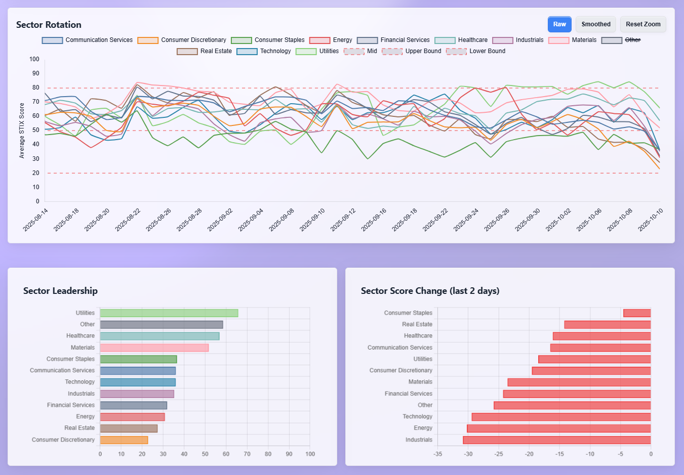 Leadership and momentum at the sector board finish the picture. Utilities sit atop the ranks, with Healthcare and Materials also elevated and holding above 50, while Consumer Discretionary and Real Estate are the laggards on a trend basis. The two-day change shows rotation toward defensives: Consumer Staples up most over 48 hours, Real Estate and Healthcare improving, while Industrials, Energy, and Technology show the steepest negative momentum. That aligns snugly with the flows above: more money into bonds and credit, staples firming, and the growth complex absorbing the shock rather than leading upside. It reads as positioning for fatter tails rather than a blanket risk-off, which matches an environment where policy uncertainty dominates and earnings are about to reset expectations.