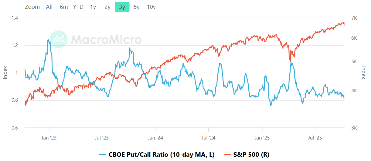The 10-day average looks low by recent standards, hovering near the lower-middle of its three-year range rather than at stress levels. In this framework, 0.8 tends to be frothy and 1.0 fearful. Current readings appear closer to the frothy side than the fearful side, which brought us to Friday’s large downside move. If equities wobble and the ratio climbs toward 1.0, that would improve rebound quality by indicating real hedging demand. Tripwires: sustained readings below roughly 0.85 would signal complacency; a spike above ~1.05 would suggest capitulation dynamics are forming and a better tactical buy window.