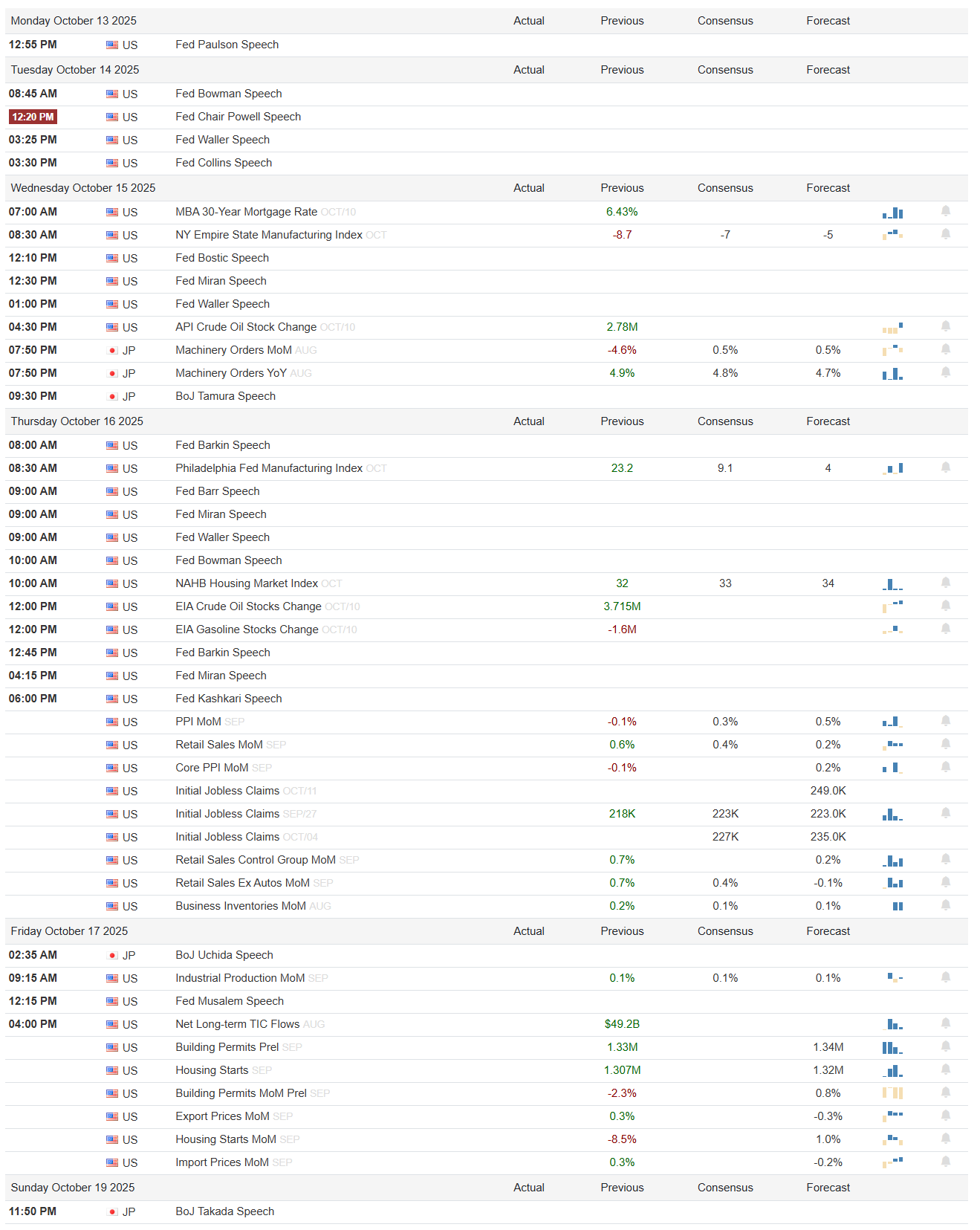 The desk is tracking the China trade situation closely. The Senate returns Tuesday. The CPI is scheduled for October 24. The Fed’s blackout arrives at the end of the week, and there is a full slate of speakers before then. Monday is Columbus Day with equities open. Q4 earnings season begins with Financials leading. Oracle (ORCL) and Salesforce (CRM) will host large tech/customer conferences next week, which means more AI news flow.