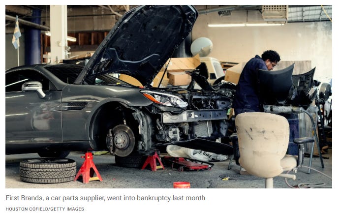 Into Friday morning, the S&P 500 was up 0.3% for the week, supported by large caps and Technology leadership. Equal-weight measures were softer, down about 1%, with meaningful divergence in small caps: the S&P 600 down almost 2% while the Russell 2000 was only down 0.3%. Beneath the surface, the credit complex had already started to wobble: bankruptcies at subprime auto lender Tricolor and auto parts supplier First Brands began to pressure consumer lenders and private credit proxies.