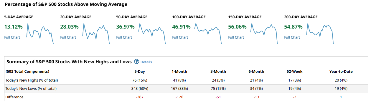 Bottom line: Short-term breadth is washed out while longer-term participation still holds a slim majority, so treat this as a correction within an aging uptrend until the 50-day cohorts and highs/lows confirm a renewed advance.