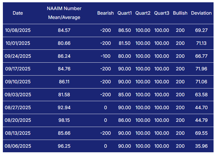 Active managers remain heavily invested. The latest NAAIM mean prints 84.57 on 10/08/2025, after 80.66 the prior week and a run of readings mostly in the low-to-mid 80s, with late August peaking near 98. This is not defensive positioning; it implies limited dry powder and some vulnerability if downside momentum accelerates. The upshot is that pullbacks can shake weak hands but also fuel quick reflex rallies because exposure is already high and managers are sensitive to lag. Tripwires: a drop into the 50s without major price damage would be a constructive reset that reloads buying power; conversely, a return to the 90s while breadth is weak would increase the risk of air pockets on bad news.