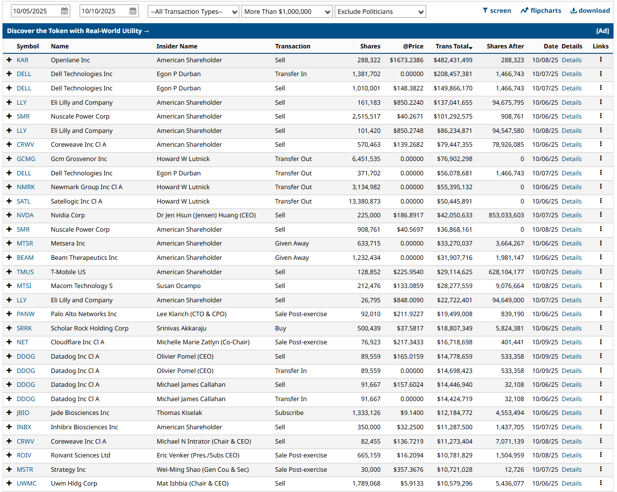 Insider flow still leans distribution. Over the last 60 days, the bar chart shows mostly red prints with only a couple of green spikes. The most active tickers by number of trades skew heavily to selling: Atlassian (84 trades, 82 sells), Coreweave (36 sells), Carvana (30 sells), The Vita Coco (25 sells), Dropbox (21 sells), T-Mobile (20 sells), Nvidia (19 sells), UiPath (19 sells), and Klaviyo (18 sells). There are some buy clusters, but they are the exception; for example Renaissance Capital shows 42 buys and Public Storage lists a mix with 9 buys. By dollars, the top tickets are dominated by sellers or mixed boards unloading: Fox Corp B at about $1.165B (1 buy, 2 sells), Tesla near $1.0B (1 buy, 3 sells), News Corp B around $824M (1 buy, 2 sells), and a string of one-sided sell totals including Solventum, Coupang, Centuri, Smithfield Foods, Coreweave (~$501M, 36 sells), and Sea. This week’s top-30 tape confirms it: multiple large open-market sales and transfers from Dell’s Egon Durban, LLY sales by an American Shareholder, Nvidia’s CEO selling 225,000 shares (~$42M), plus selling across TMUS, PANW, NDAQ, DDOG, CRVW, and others. A few non-price transactions show up (awards, transfers, given away), but open-market sales are the dominant motif. Until we see broad-based, repeat open-market buys in the high-beta complex, the insider signal stays risk-averse.