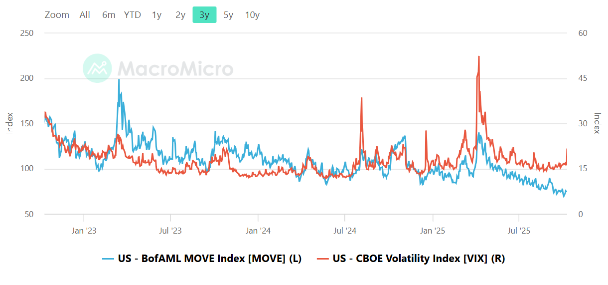 Bond vol (MOVE) is subdued and trending lower into the 90s, while equity vol (VIX) has lifted into the mid-to-high teens with a recent uptick. The two have diverged modestly: calmer rates alongside jumpier stocks. Historically, a MOVE spike ahead of VIX often precedes equity stress; we do not have that warning right now. Instead, the setup looks like an equity-specific risk repricing against a steady rates backdrop. That mix can resolve either with VIX cooling if price stabilizes, or with a catch-up MOVE pop if macro shocks reappear. Tripwires: MOVE pushing above ~120 while VIX sits sleepy would be a yellow flag; VIX pushing sustainably above the high teens and into the low 20s without a MOVE echo would argue for tighter risk until the gap closes.