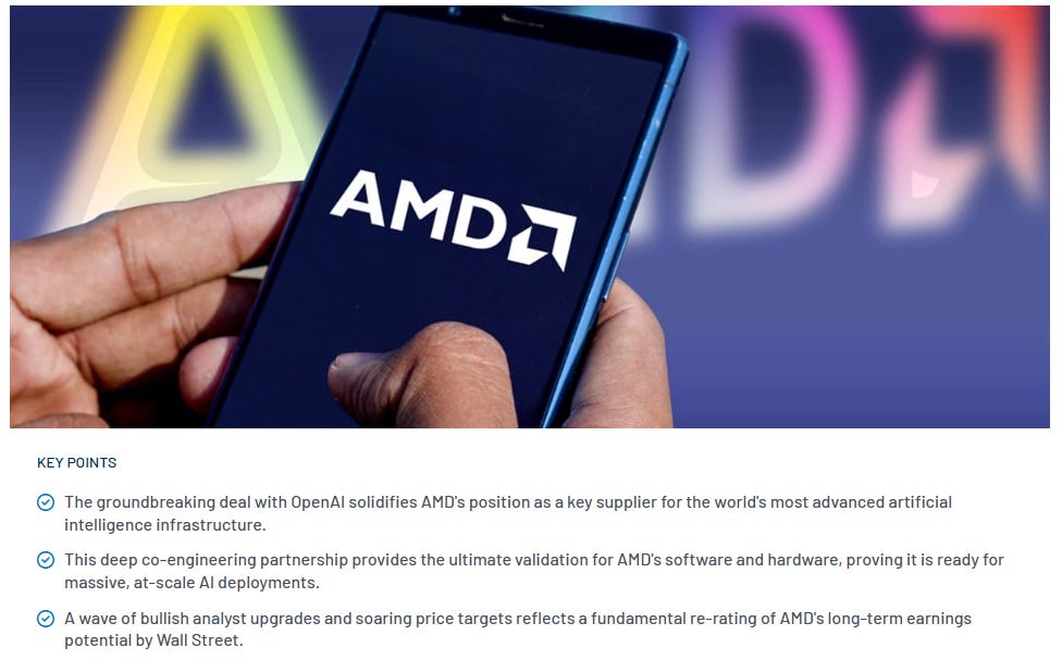 AI-linked momentum was still powerful. Advanced Micro Devices (AMD) rallied more than 20% on Monday after announcing a partnership with OpenAI that included OpenAI purchasing 6 gigawatts of AI chips from AMD and receiving warrants to purchase up to 160 million AMD shares (10% of the company). AMD subsequently climbed even further, at one point up ~40% on the week. Reports also suggested Elon Musk’s xAI was close to raising $20 billion to acquire more AI infrastructure, including GPUs, with Nvidia (NVDA) among the investors. Oracle (ORCL) came under modest pressure on chatter that renting out Nvidia chips was weighing on profitability. The circularity of AI supply and demand—suppliers investing in customers and vice versa—was growing more conspicuous, but until Friday, it had not checked the theme or the market’s drift to new highs.
