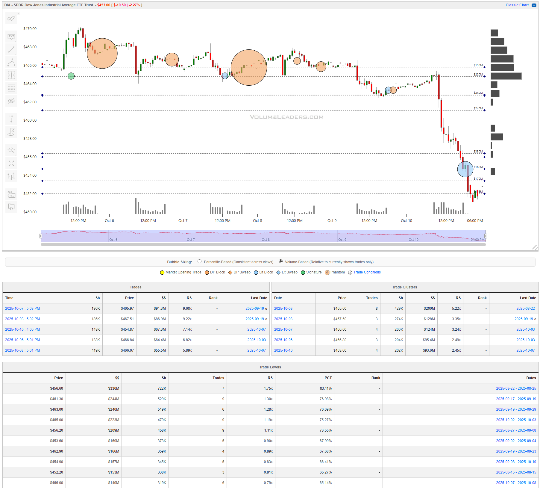 DIA’s map is cleaner: heavy trade centered $463–467 with the close pinned below. Notables include 196K at $465.97 for $91.3M (RS 9.68x) and 186K at $467.51 for $86.9M (RS 9.22x). Clusters top out at $465.00 ($200M, RS 5.22x) and stack at $467.50, $466.00, $466.80, and $463.60. Levels echo the overhead weight: $456.60 ($330M, RS 1.75x, 83.11th pct) is the closest pivot below, while $461.30–$465.00 adds $244–$223M each. For next trade, $456–457 is initial support; recoveries must reclaim and hold above $461–463 to squeeze into $465–468. Failure back under $456.20 points to $454.90 then $452.20.