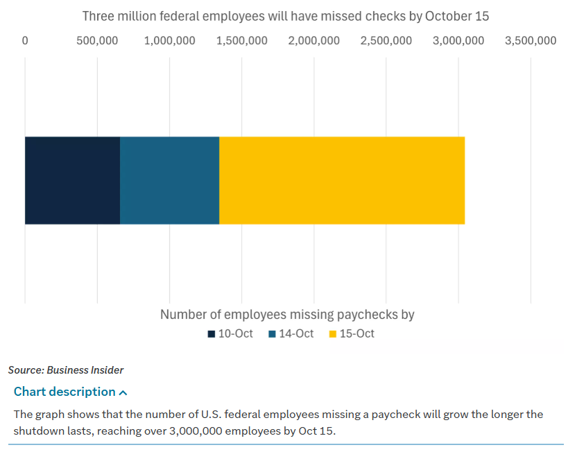 The government shutdown added a second tailwind to bonds. Concerns about additional job losses, reduced consumer spending, and a weaker economy provide a rationale for continued Fed cuts if the shutdown persists. The shutdown is now in its second week. It is weighing on market sentiment and delaying key reports, including the last two weeks of initial jobless claims, Tuesday’s August trade report, and last Friday’s monthly payroll report. The BLS said it will release September CPI on October 24 if the shutdown extends into next week; the original date was October 15. The White House warned that a prolonged shutdown could force broad dismissals of employees in programs that do not align with administration priorities. Bloomberg Economics estimates that 640,000 federal workers will be furloughed during the shutdown, expanding jobless claims and pushing the unemployment rate up to 4.7%.