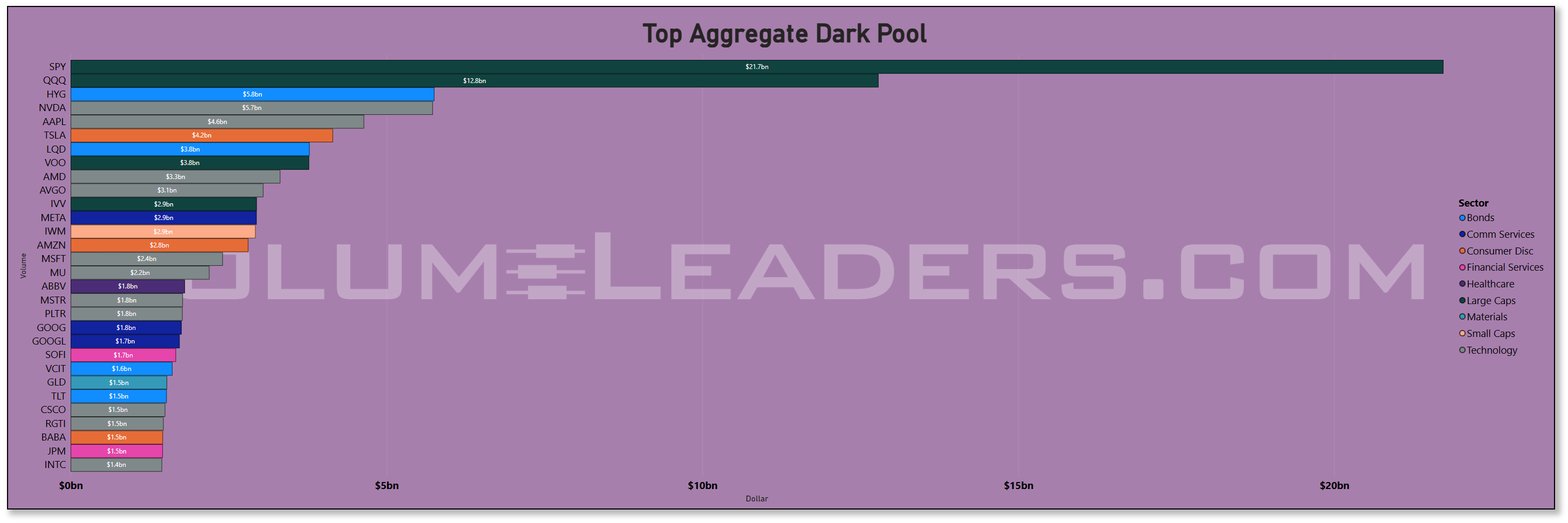 Off-exchange activity adds context. Dark-pool dollars were heavy in the broad indices and the same megacaps: SPY ~$21.7b and QQQ ~$12.8b towered over the list, followed by HYG ~$5.8b, NVDA ~$5.7b, AAPL ~$4.6b, and TSLA ~$4.2b. Investment-grade and Treasury proxies (LQD ~$3.8b, TLT ~$1.5b) plus VOO/IVV each near the ~$3–4b band suggest portfolio-level adjustments rather than a purely speculative burst. When dark interest concentrates in index wrappers and the largest growth leaders during a drawdown, it often signals inventory transfer and hedged accumulation by the slower money rather than hot-hand de-risking.