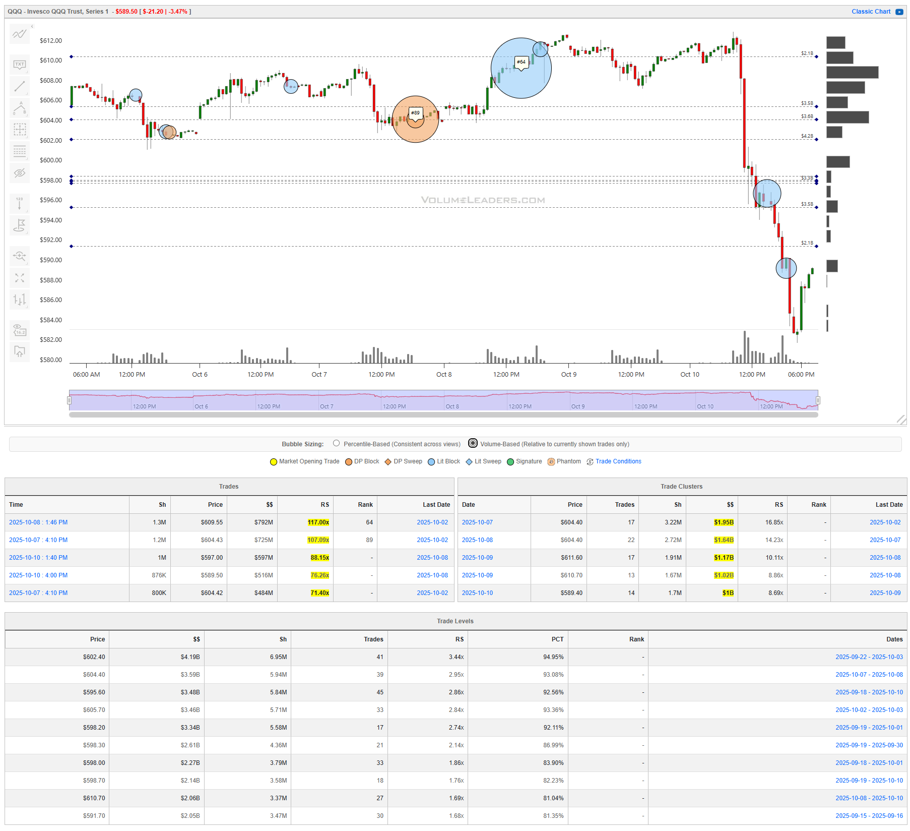 QQQ’s break was equally decisive, but the footprint skews a touch firmer near the lows. Notable prints included 1.3M at $609.55 for $792M (RS 117x, rank 64) and 1.2M at $604.43 for $725M (RS 107x, rank 89), followed by $597.00 ($597M, RS 88x) and $589.50 ($516M, RS 76x). The biggest clusters sit at $604.40 ($1.95B, RS 16.85x) with a second tranche at the same price ($1.64B), then $611.60 ($1.17B), $610.70 ($1.02B), and a lower plate at $589.40 ($1.00B). The Level stack is dense from $598–606: $602.40 carries $4.19B (RS 3.44x, 94.95th pct), $604.40 $3.59B (RS 2.95x), $605.70 $3.46B (RS 2.84x), and $598.20 $3.34B (RS 2.74x), with supportive layers at $598.30–$598.70 and a higher cap near $610.70 ($2.06B). That makes $602–606 the pivot band; above it, $610–612 is the next magnet; below it, $598 then $589 are the risk shelves. Buyers have the better trade pressing holds above $602 with risk just under $598; sellers want to fade failed pushes into $610–612 with risk over $613.