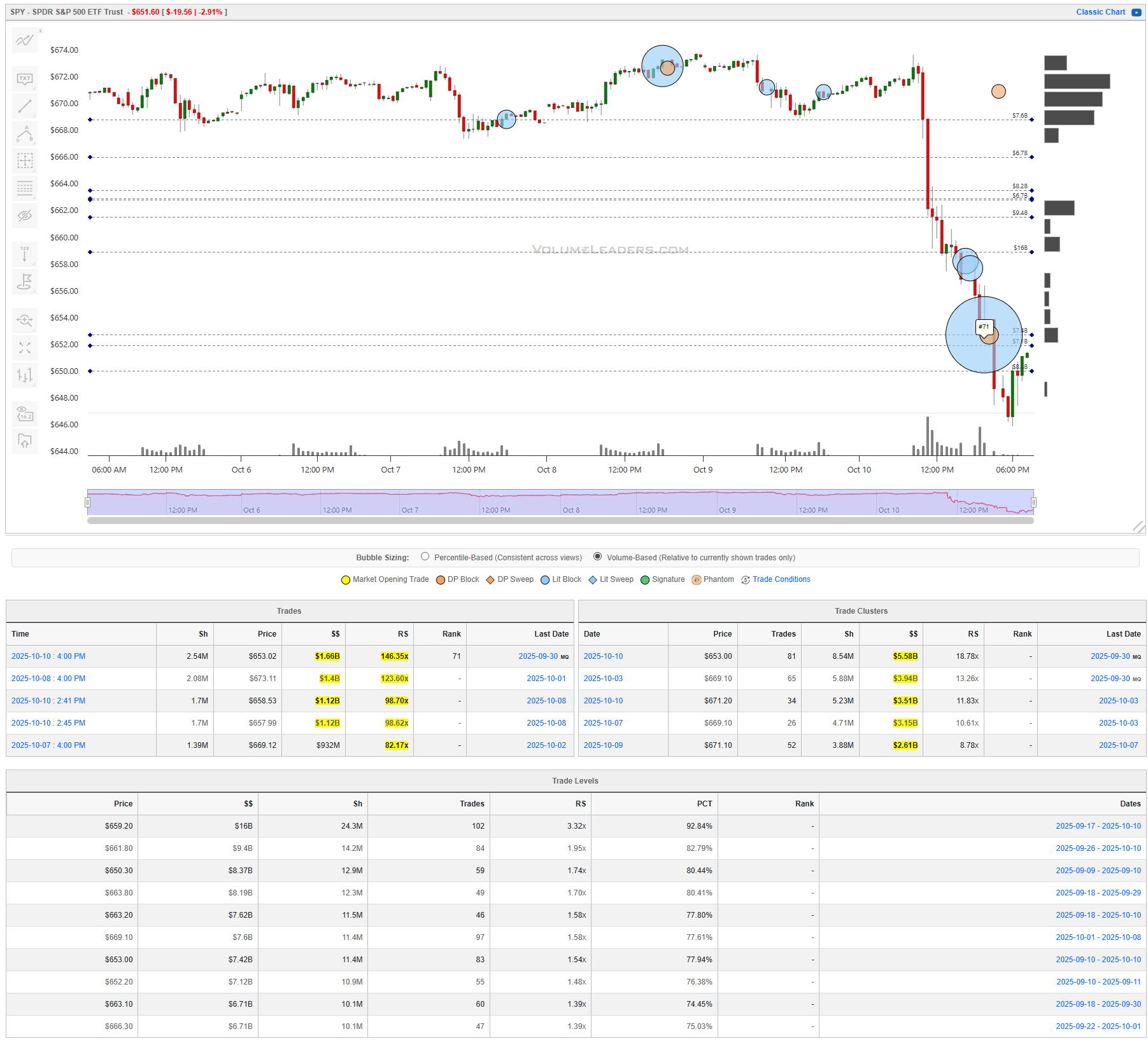 SPY fell hard into the low 650s and printed a top-100 block at 4:00 PM: 2.54M shares at $653.02 for $1.66B (RS 146x, rank 71). That was not alone; a series of billion-dollar prints hit between $657.99 and $673.11 with RS readings in the ~99x–124x zone. The cluster table stacks the heaviest time-bound interest at $653.00 ($5.58B, RS 18.78x), $669.10 ($3.94B, RS 13.26x), $671.20 ($3.51B, RS 11.83x), then again at $669.10 and $671.10. Cumulative Levels reinforce the same map: $659.20 carries $16B (RS 3.32x, 92.84th pct), with thick layers at $661.80 ($9.4B), $653.80 ($8.19B), $653.20 ($7.62B), $669.10 ($7.60B), $653.00 ($7.42B), and $652.20 ($7.12B). That makes $652–654 first support, $659–662 the primary pivot, and $669–671 the immediate supply shelf. Acceptance back above $659–662 would argue for a squeeze toward the $669–671 magnet; rejection under $653 would reopen the lower band around $652–650, where another $8.37B sits at $650.30. Tactically, bulls want to buy pullbacks that hold $653 with an initial target into $659–662 and a trailer toward $669–671; bears are favored on failed retests of $659–662 with risk above $663 and first targets $653 then $652–650.