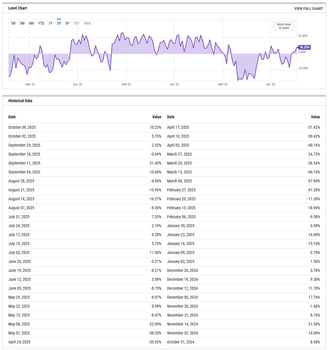 The bull minus bear spread has turned up to 10.23% as of 10/09/2025 from 3.75% a week earlier and 2.52% two weeks ago. That is a notable improvement from mid-September’s negative readings, including -21.45% on 09/11/2025. We are back above zero but still well shy of exuberance. Historically, sub-0% is contrarian supportive for rebounds, while persistent readings above ~20% can get crowded. The present 10% zone says pessimism is easing but positioning is not stretched; there is room for sentiment to improve further if price can stabilize. Tripwires: a break back below 0% would warn that the bounce is losing sponsorship; a push through 20% without confirming breadth would caution that optimism is getting ahead of the tape.