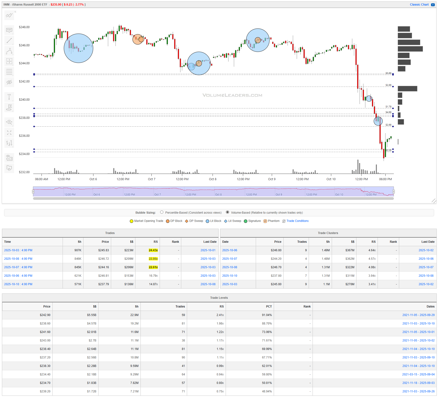 IWM showed the same liquidation but with smaller absolute tickets and a narrower battlefield. The biggest prints came late: 907K at $245.83 for $223M (RS 24.43x), 846K at $246.72 for $209M (RS 22.86x), and 845K at $244.16 for $206M (RS 22.61x). Clusters concentrate at $246.80 ($367M, RS 4.64x) and $244.20 ($362M, RS 4.57x), with smaller nodes at $246.70, $237.80, and $245.80. The Level table turns the $237–243 region into a fulcrum: $242.90 carries $5.55B (RS 2.41x, 91.04th pct) and $238.60 $4.57B (RS 1.98x), with additional layers stepping every dollar through $237.20–$243.00. Translation: $241–243 is the line of scrimmage. Above it, $246–247 is the magnet where this week’s sellers live; below $239, risk shifts to $237 and then the low $234s. Longs should respect invalidation below $239; shorts should lean against $246–247 unless $247 holds, in which case cover toward $249.