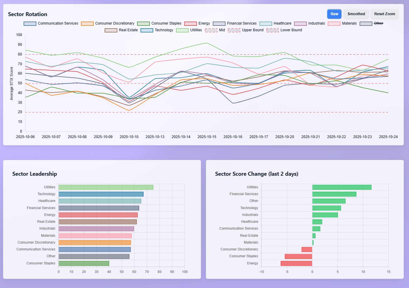 Utilities sat atop the leadership board and accelerated on the 2-day change. In a world where the market expects policy easing soon and the data flow remains compressed, a small regulated-carry sleeve gives rate-sensitive income without giving up too much beta. The add is tactical and will be revisited post-Fed.