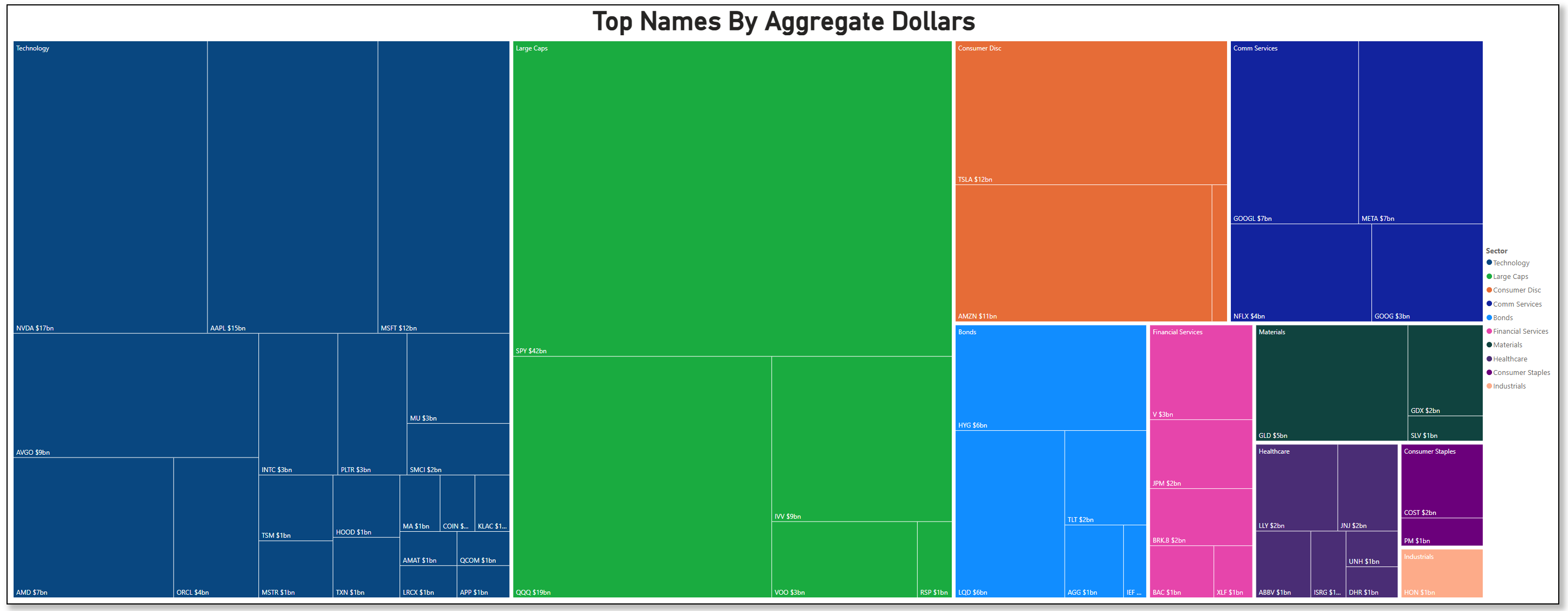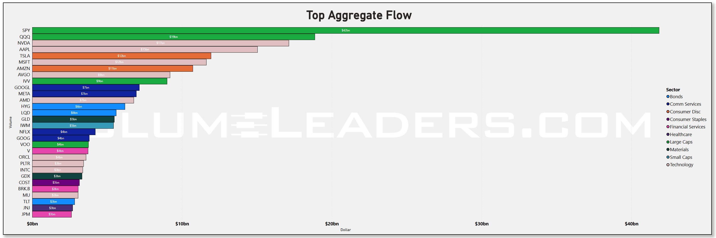 Consensus levels tell us where big money finally agrees on “fair value,” and this week’s tape shows that agreement forming in all the right places for an allocation-led market. The list is dominated by broad wrappers and large, cash-flowing franchises, with a notable halo in software and semis and a quiet but persistent re-engagement in real estate and financials. That is exactly the barbell we have been trading: index and quality carry on one side, innovation and selective cyclicals on the other, heading into the FOMC on Oct 28–29 and the Q3 GDP advance print on Oct 30.