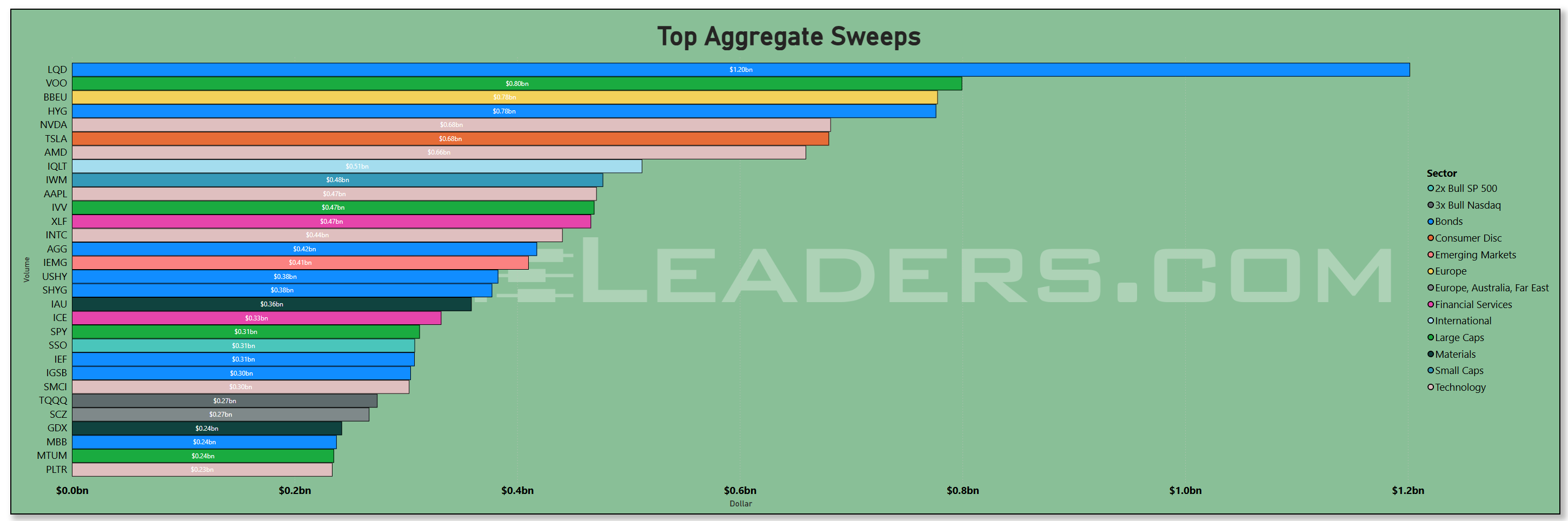 International diversification is peeking through the door rather than kicking it down. DBEU and SCZ showed real prints, with EWC/EWD and IOO adding steady but smaller interest. That pairs neatly with BBEU’s prominence in sweeps earlier this week and says managers are willing to nibble on developed ex-US quality while the U.S. policy path is center stage. If GDP lands near consensus and the Fed delivers, those wrappers typically see follow-through as macro uncertainty compresses.