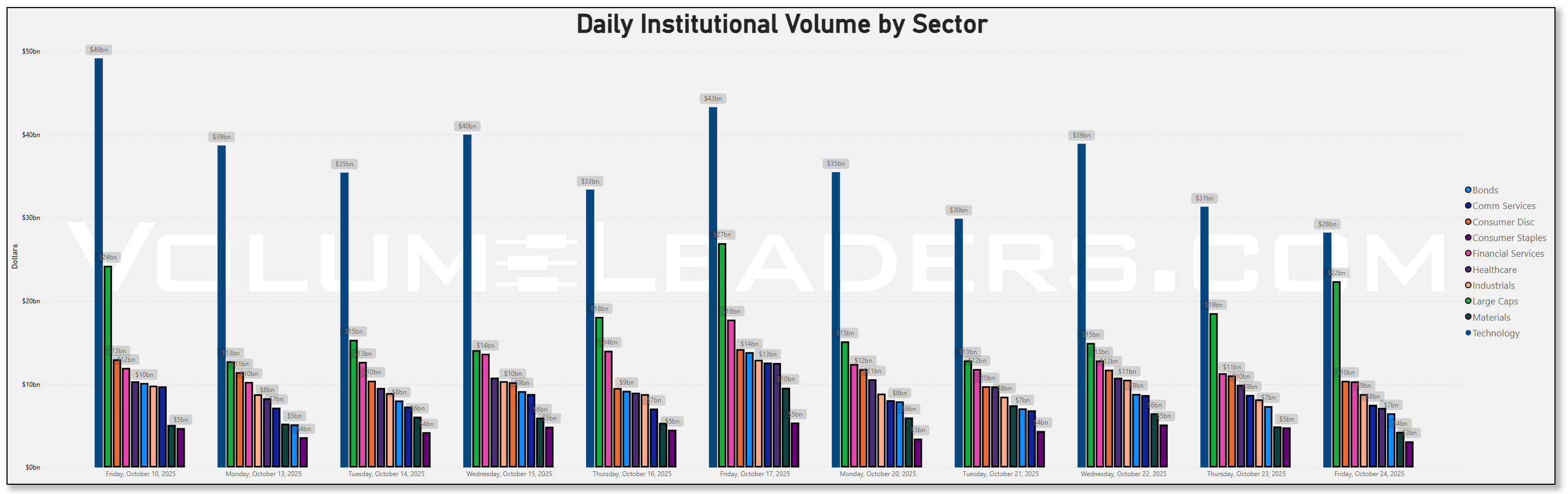 Net of all the tickers, the emergent theme from consensus levels is simple and consistent with the rest of the flow complex: institutions are building and defending volume-by-price shelves in index wrappers, equity income, and rate-sensitive quality; they are extending sponsorship down the tech stack into semis and enterprise software; they are reopening real estate and financials at pragmatic prices; and they are keeping a measured cyclical sleeve in energy, industrials, and materials without declaring a reflation regime. The macro scaffolding is supportive but unresolved. The Fed is on deck Oct 28–29, CPI just landed, and GDP arrives Oct 30, so acceptance where liquidity is deepest is exactly what we would expect to see. If those catalysts land benignly, these VBP shelves are staging grounds for the next leg higher; if they disappoint, they will be the first places to test for buyers on pullbacks.