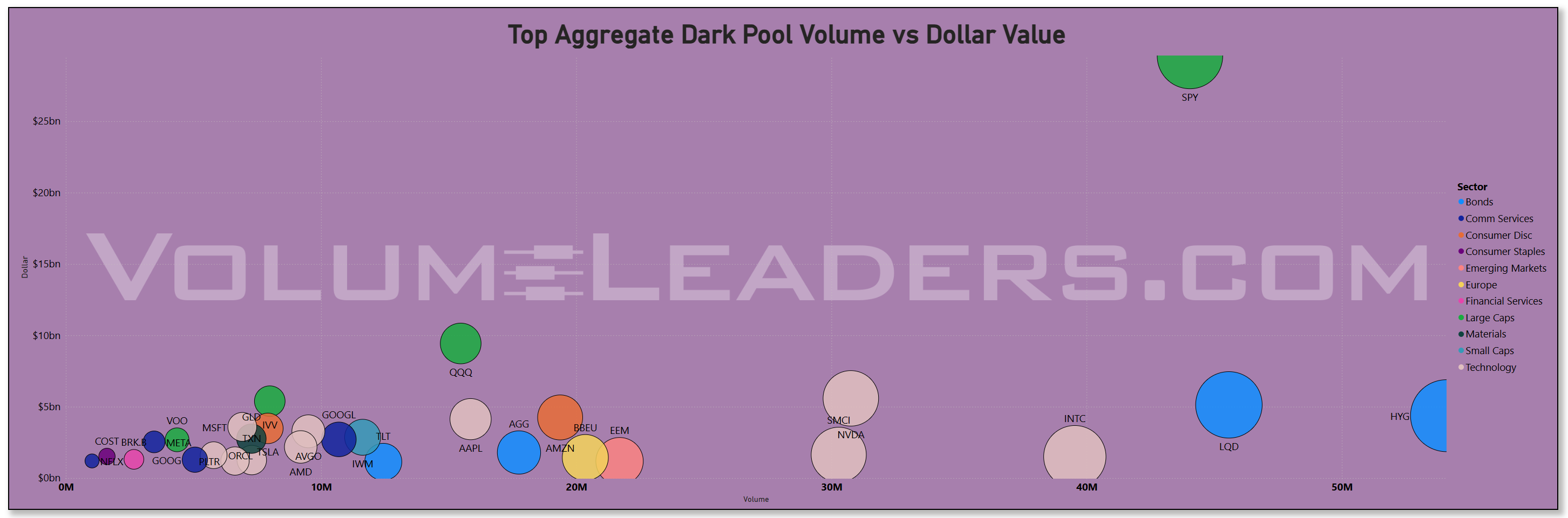 This is the throttle. SPY and QQQ took the lion’s share of aggregate dollars and the deepest dark-pool sponsorship, which is precisely what you want in front of a Fed and GDP week: you can modulate net exposure in one place without tearing up the rest of the book. If liquidity spikes around the decision or the press conference, this sleeve expands or contracts first. The setup is aided by the event path being crystal clear on timing even if outcomes are debated.