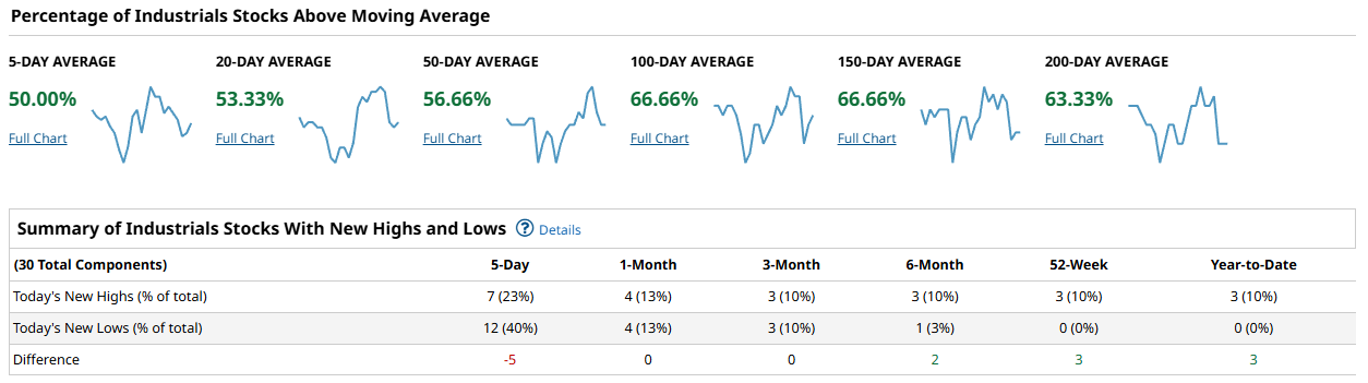 Now look at the Dow Industrials. The Dow screenshot is labeled “Industrials,” and it shows breadth stats for 30 total components. Here, the tone is different, and importantly, it is better. On the shortest horizon, 50.00% of Dow components are above the 5-day moving average. The participation is even stronger on longer windows: 53.33% are above the 20-day, 56.66% above the 50-day, and 66.66% above the 100-day. That 66.66% figure holds at the 150-day as well, and 63.33% are above the 200-day. That is the highest medium-term participation of the four groups. This is what healthy trend looks like. The new high / new low table is also the cleanest of the bunch. Over the past 5 days, 7 Dow names (23%) printed new highs while 12 (40%) printed new lows, for a net of -5. On the 1-month, 4 highs (13%) vs 4 lows (13%), net 0. On 3-month and 6-month views, the net is 0 and +2. On a 52-week basis the net is +3, and year-to-date it is also +3. That is a major contrast with the S&P 500, Nasdaq 100, and Russell 1000, where the net new highs minus new lows is negative across most windows. The Dow has not escaped short-term chop, and the 5-day net is still -5, but it is the only major cohort where the intermediate and longer windows are not flashing broad deterioration.