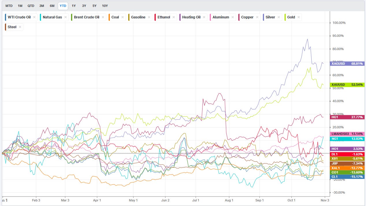 Commodities and crypto traded like leverage to global macro and policy expectations throughout October. Oil was volatile but ultimately finished lower. ICE Brent Crude failed to clear its 50 and 100 day moving averages in early October and traded down from roughly 66 USD to roughly 61 USD before jumping back up late in the month. Brent then climbed to test all three major moving averages and is now sitting just below its 50 day level of about 65 USD. New Russian sanctions helped push crude prices higher, while traders worked through speculation that OPEC+ might deliver a small output increase at its next meeting. Brent finished the day at 65.07 USD per barrel, up 0.07 USD, and is down roughly 1.5% for the month and a similar amount this week. U.S. natural gas was stronger. Nat gas added 6% on the month and 3% on the week as colder forecasts and lower injections supported price. Agriculture was firm as well. China’s agreement to restart U.S. soybean purchases drove soybeans higher this week, and agricultural products were up solidly on the month.