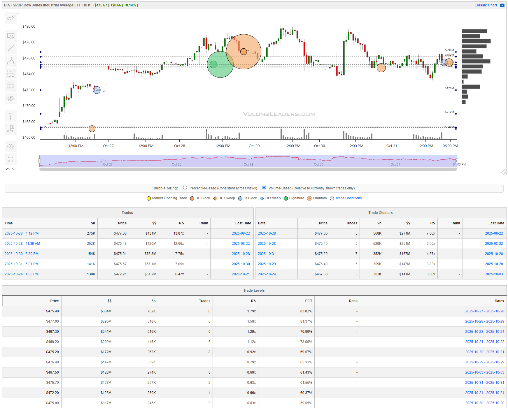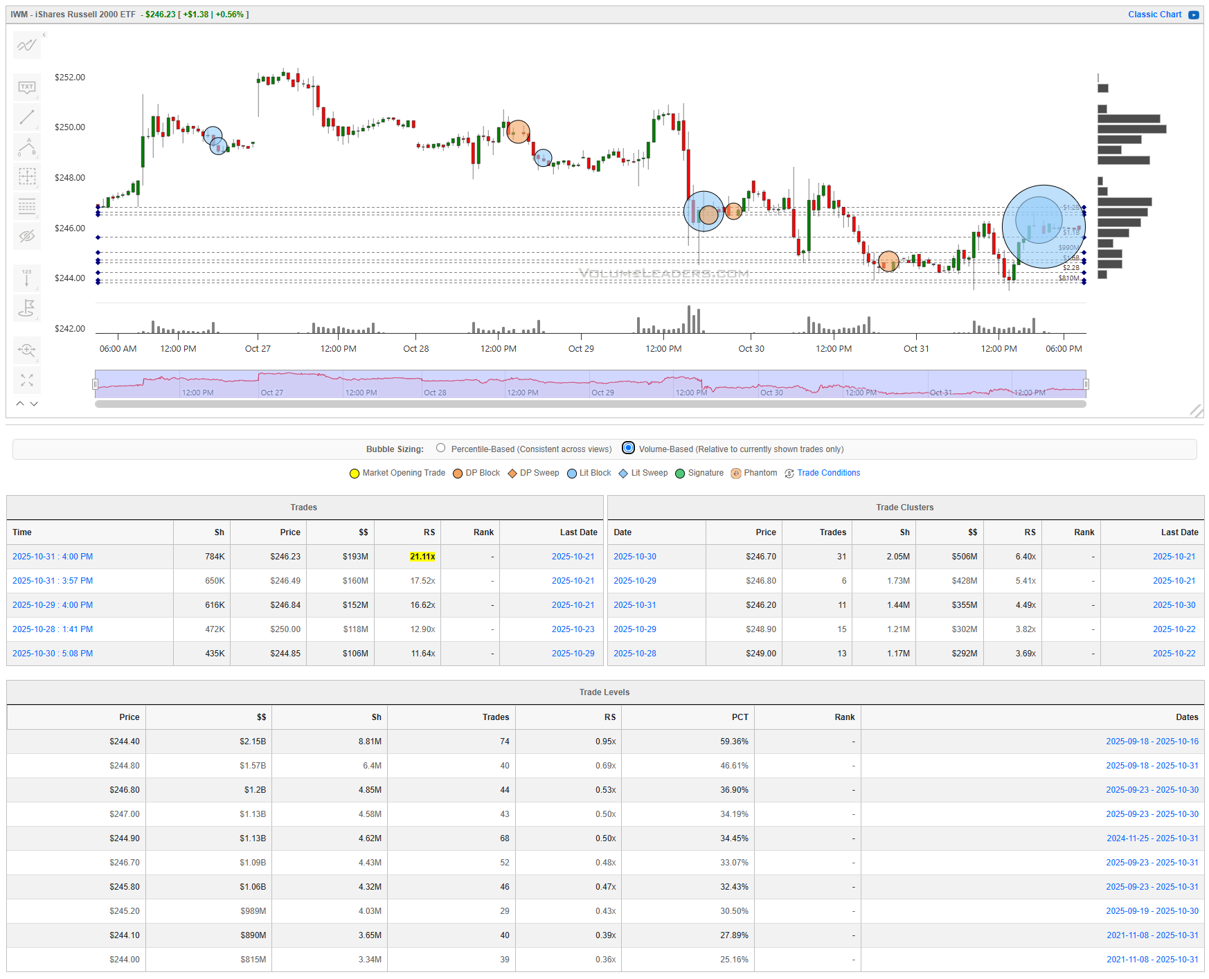 DIA, representing the Dow 30, painted the cleanest structure. After its own gap, the ETF rallied into $480 before fading into a tight balance between $472 and $476. The week’s largest trades — $131M at $477 and $120M at $475.40 — anchored the top of the range, each with RS above 12×. Supporting demand emerged around $472, where multiple $100M–$150M prints clustered with RS in the 6–7× range. Trade levels confirm a strong positioning $475.40 ($334M, 83rd percentile) and a secondary pocket at $472.20 ($117M). A breakout above $477 would be the first sign of renewed risk-on flow, opening a path to $480+. Conversely, failure to hold the week’s close turns all of this into inventory that would unwind toward $468-$472. Tactical traders might treat $475 as the midpoint for balance trading — long above with $477 targets, short below with $472 as the first stop.