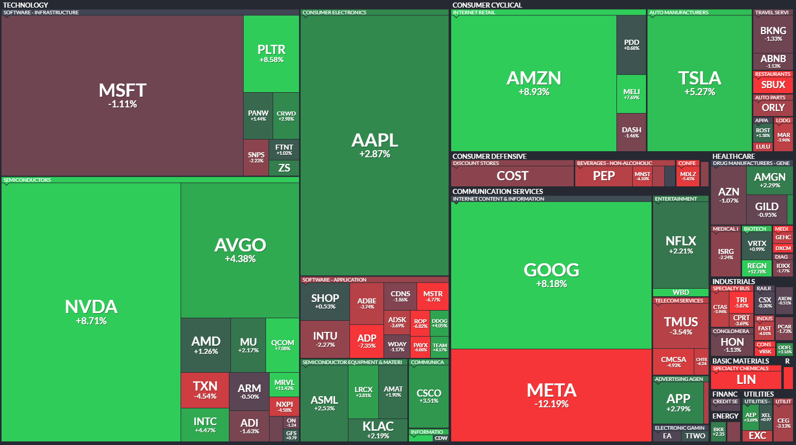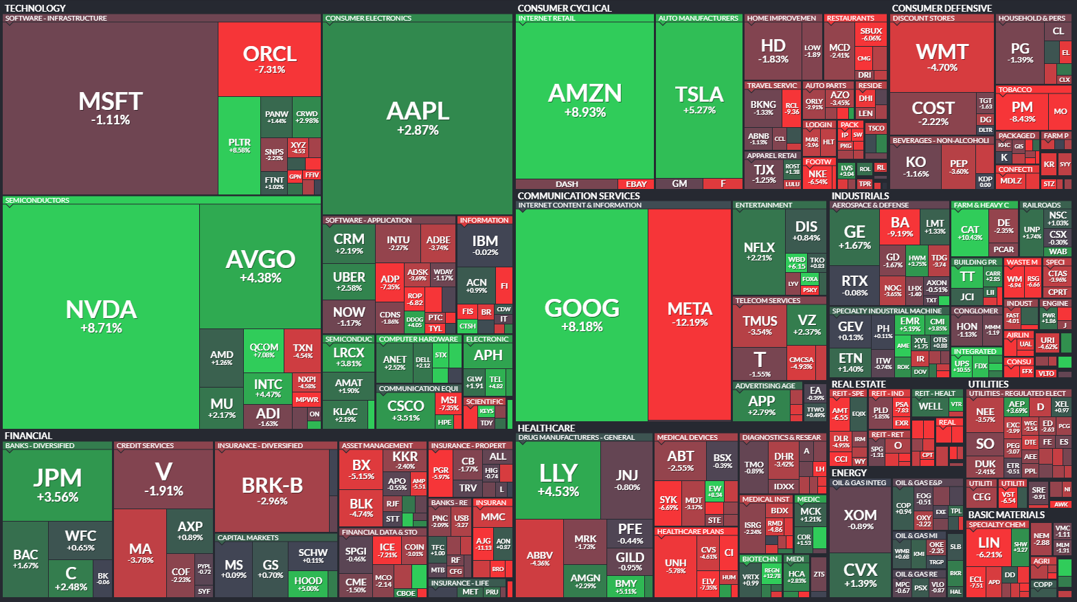 Qualcomm (QCOM) said it was building its own AI chip. Advanced Micro Devices (AMD) announced that it would be partnering with the government to build two supercomputers. Those announcements helped the ICE Semiconductor index finish the week up more than 3% and more than 10% for the month. Alphabet (GOOGL) and Amazon.com (AMZN) traded higher following earnings, while Microsoft (MSFT), Apple (AAPL), and Meta Platforms (META) saw more mixed reactions, including pullbacks tied to underwhelming results and investor unease with the cost of future AI-driven investment. Still, even with that push and pull, the AI trade remains the most powerful narrative in equities. The so-called Magnificent Seven companies are still dictating weekly performance for the large-cap complex.