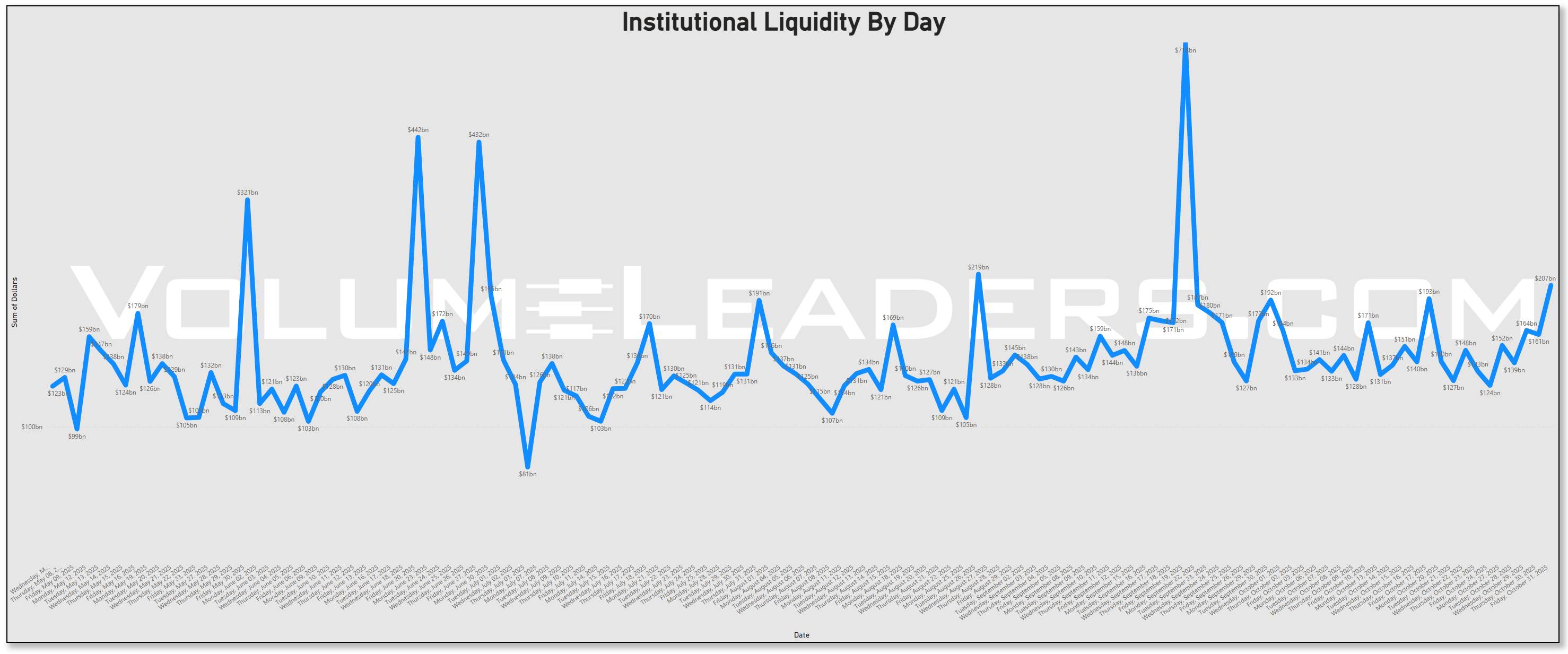 Institutional liquidity rose sharply late in the week, with a pronounced surge on Friday, October 31 that extended into the $207 billion+ range (from levels closer to ~$140 billion earlier in the week). That marks a clear month-end tilt and suggests heavy portfolio rebalancing rather than simply a directional rush. The multi-day uptick around the close supports the idea of funds locking in exposure ahead of the new month, echoing the documented “turn-of-the-month” effect where institutional buying tends to concentrate at the end and start of each month.