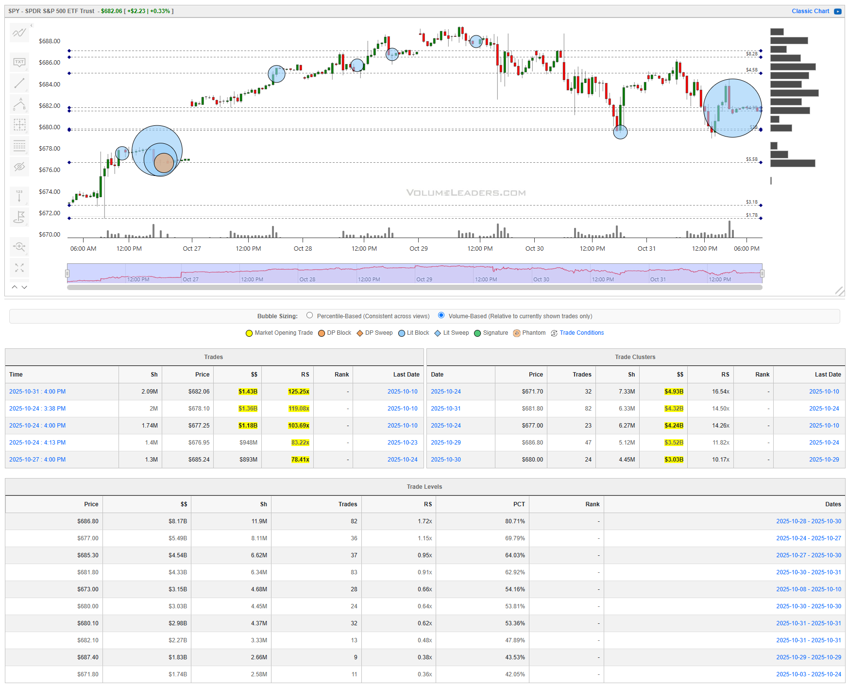 In SPY, the post-gap sequence from $672 to $682 carried strong sponsorship. The tape registered several multi-hundred-million prints: $1.18B at $677.25, $1.31B at $678.10, and a dominant $1.43B closing cross at $682.06 — the largest notional of the period with a 126× relative size multiple. These trades, all ranked in the top percentile of historical activity, reflect institutional distribution into strength rather than panic buying. Supporting that view, trade clusters between $677 and $682 amassed $4–4.3B in flow with RS values above 14×. That band now forms the ceiling of control. Below, $675 and $670 remain layered with $5.4B and $3.2B of volume, creating a deep demand shelf. As long as SPY holds that $674–$677 band on a gap-close, the market can attempt to consolidate and push higher. Acceptance above $682 opens a measured path to $688–$690. A failure back through $674, however, would invalidate the recovery and expose levels from prior weeks. Tactically, disciplined longs should anchor bias to $676 and above for continuation setups; shorts may fade rejections near $682 with $686 as the stop band.