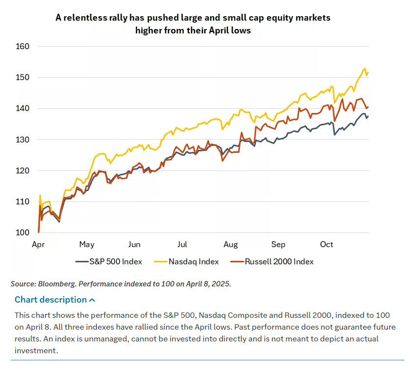 The concessions include resumed rare earth exports from China and resumed agriculture purchases from China, while the U.S. cut the fentanyl-related tariffs in half and delayed a rule that would have expanded restrictions on blacklisted Chinese firms. While in Asia this week, President Trump also finalized a trade deal with South Korea and announced partnerships with Japan related to rare earth minerals and nuclear technology. President Trump said South Korea agreed to pay 350 billion USD in exchange for lower tariffs and will buy American oil and gas “in vast quantities.” He also said he gave his approval for South Korea to build a nuclear-powered submarine at a Philadelphia shipyard. More details around a U.S.-Japan trade deal were also cited as supportive for sentiment in Japan. The rumor mill even extended to an anecdote about President Trump pushing for increased U.S. hotdog exports while watching the World Series with new Prime Minister Takaichi in order to offset what he characterized as Japan’s “awesome baseball players” trade imbalance. This is the current backdrop for risk assets: tariff escalation followed by rapid tariff de-escalation, and the sense that, for now, the U.S. and China are content to pause open escalation.