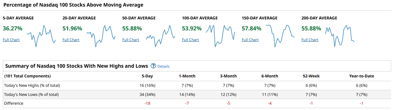 The Nasdaq 100 is telling a similar but slightly different story. On the surface, the megacap tech complex still looks dominant, but internally it is not exactly a picture of health. Only 36.27% of Nasdaq 100 components are above the 5-day moving average. That improves at the 20-day, where 51.96% are above, and again at the 50-day, where 55.88% are above. By the 100-day, participation fades to 53.92%, and by the 150-day and 200-day, the numbers are 57.84% and 55.88%, respectively. So unlike the S&P 500, which cannot get to 50% above the 50-day, the Nasdaq 100 can, and sits in the mid-50s across the 20-day through 200-day lookbacks. That is still not roaring strength, but it is notably better than the broader market. The stress shows up in the new highs and new lows data. Over the past 5 days, 16 names (16%) hit new highs, but 34 names (34%) hit new lows, for a net of -18. Over 1 month, 7 names (7%) made highs while 14 names (14%) made lows, net -7. Over 3 months the net is -5, over 6 months it is -4, and even on a 52-week view, new lows edge out new highs by -1. Year-to-date, it is also -1. The Nasdaq 100 is still leading on relative terms, but even in the engine room of AI and mega-cap growth, new lows are outpacing new highs across almost every time frame. That is not what you typically want to see if you are betting on uninterrupted upside.