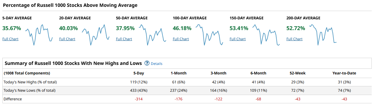 Finally, the Russell 1000 gives us the read on the broader U.S. large and mid-cap universe. This is where the stress is most obvious. Only 35.67% of Russell 1000 components are above the 5-day moving average. 40.03% are above their 20-day. 37.95% are above their 50-day. That is worse than the S&P 500 on the 50-day measure, and it tells you that most of the Russell 1000 is below intermediate-term trend. Things improve at the 100-day, with 46.18% above, and improve again at the 150-day and 200-day marks, where 53.41% and 52.72% of stocks are above, respectively. So just like the S&P 500, the Russell 1000 still has about half its members hanging on to longer-term trend structures, but fewer than 40% are holding their 50-day. The new highs vs new lows table is where it really breaks down. Over the past 5 days, 119 names (12%) hit new highs, while 433 names (43%) hit new lows. That is a -314 net. Over 1 month, 61 names (6%) hit highs, versus 237 (24%) printing lows, net -176. Over 3 months, 42 highs (4%) vs 164 lows (16%), net -122. Over 6 months, 41 highs (4%) vs 109 lows (11%), net -68. Even on the 52-week view, the net is -43, and year-to-date the net is also -43. This is decisive. The Russell 1000 is not quietly firming under the surface. It is getting wider new low expansion across every major time frame.