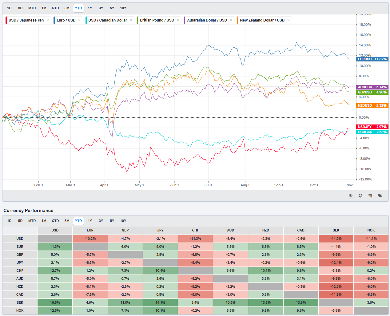 Asia told a different story. Japan’s Nikkei reached 50,000 for the first time ever and kept going. The Nikkei is now above 52,000, after gaining 6% for the week and roughly 16% in October. Japanese equities were helped by the continued AI trade, a new administration, the Bank of Japan keeping rates on hold, a weakening yen, and optimism tied to the U.S.-Japan trade deal that was further outlined this week. China was more muted. For October, the Hang Seng fell 3.5% while the Shanghai Composite rose 2%. The Hang Seng has seen a modest pullback after hitting a year-to-date high in early October. The Shanghai Composite reached a 10-year high before fading into month-end and closing near last week’s levels. Chinese markets finished flat to slightly lower this week despite the Trump / Xi Jinping meeting. The current situation can be categorized as a tepid truce. China’s next five-year plan proposal was published this week, focusing on industrial modernization, defined as taking technology breakthroughs into scaled production, and on domestic demand. Official Chinese PMIs this week showed manufacturing activity falling more than expected at 49 versus 49.6 consensus and 49.8 last month. Elsewhere in emerging markets, South Korea continued to surge, gaining 4% this week and 20% for the month. The trade deal with the U.S. that President Trump finalized in Asia helped extend that move, including the commitments on tariffs, energy purchases, and defense cooperation. Argentina exploded higher this week following stronger than expected election results for President Milei’s party, adding to earlier gains that followed U.S. currency interventions aimed at stabilizing the peso.