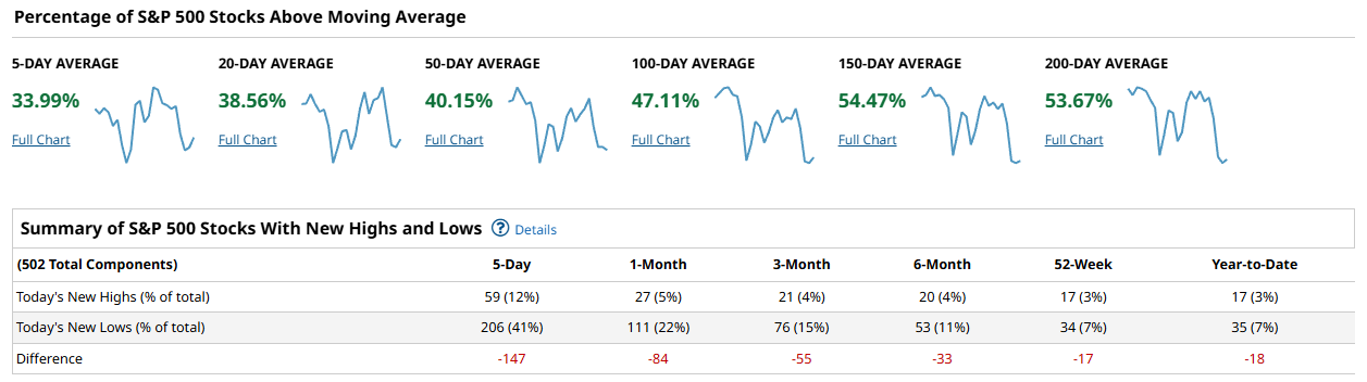 The risk tone is more defensive than the index levels suggest, and the data shows it clearly. Across the major U.S. cohorts, new lows are swamping new highs on every short-term window except the Dow Industrials, and most indexes have only about one-third to one-half of their members above the key moving averages on a 5-day to 50-day basis. This is not how durable advances are usually built.