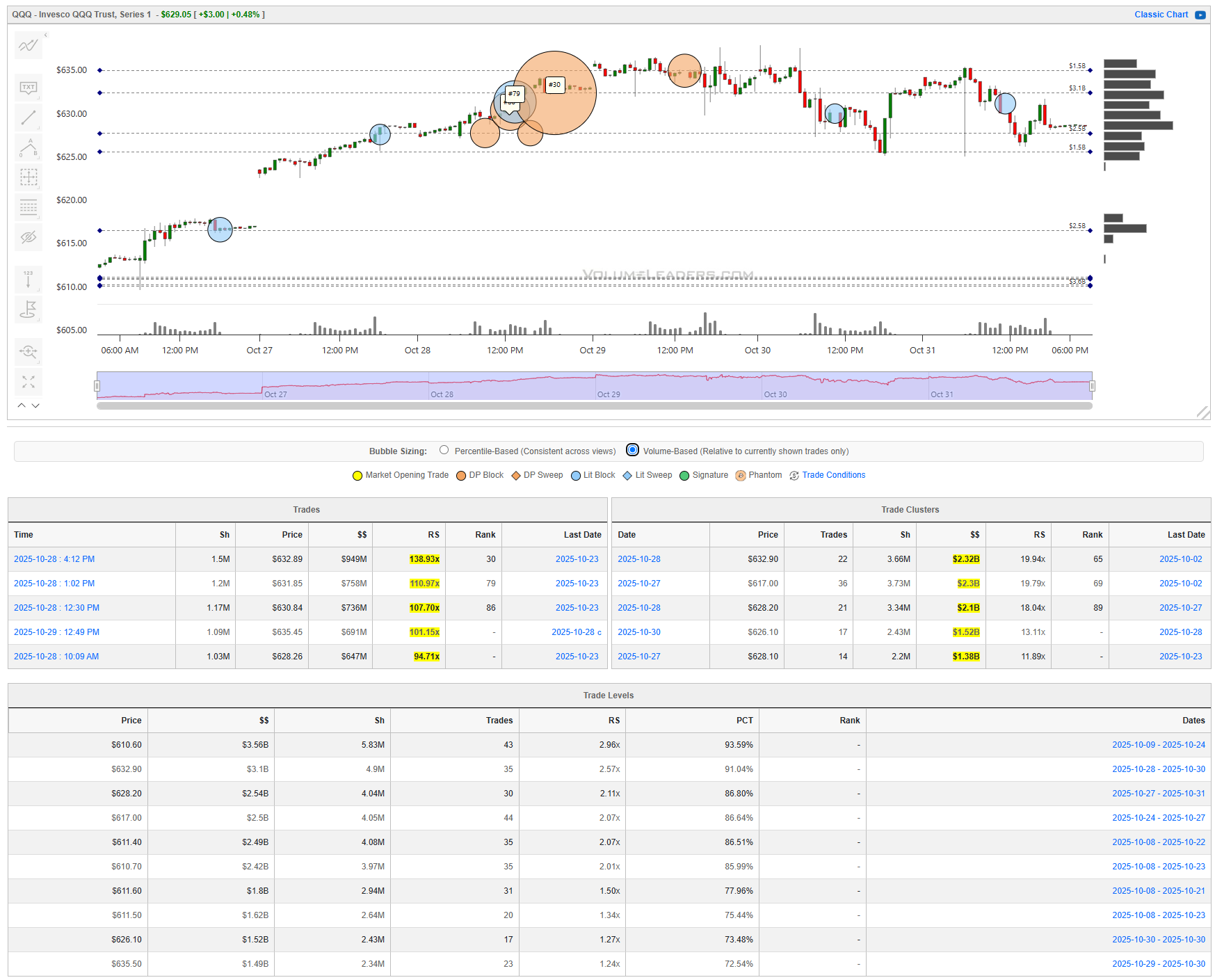 The QQQ tape this week reflected classic distributive behavior following an opening gap and early squeeze that exhausted into size. After a strong lift off the October 24 close, price accelerated through $620 and $625 before encountering a wall of institutional supply on October 28. The key inflection zone centered on $630–$633, where three distinct high-ranking prints anchored the week’s structure: #86 near $617 early in the session, #79 near $621 as follow-through buying extended, and the standout #30 block at $632.90 — a $984M DP block representing 1.5M shares and an exceptional 138.9× relative size multiple. The smaller companion prints that followed at $631.85 ($756M, RS 110.97×) and $630.40 ($630M, RS 107.70×) confirmed that heavy hands were unloading into strength rather than initiating new longs.