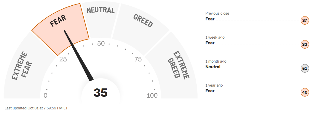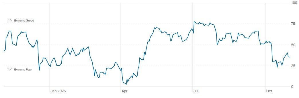 The CNN Fear & Greed composite reads 35, up modestly from 33 last week but still firmly in the “Fear” zone and below the neutral threshold of 50. One month ago the index was 51, while a year ago it was 40. The one-year chart shows sentiment cycling lower since midsummer, with brief rebounds failing to escape the lower half of the range. The pattern suggests investors remain cautious but not panicked. Historically, readings below 25 correspond to washed-out conditions and strong forward returns, while levels above 75 indicate exuberance. With the current score near the upper edge of fear, markets have room to improve if macro data stabilizes, but optimism is still tentative.
